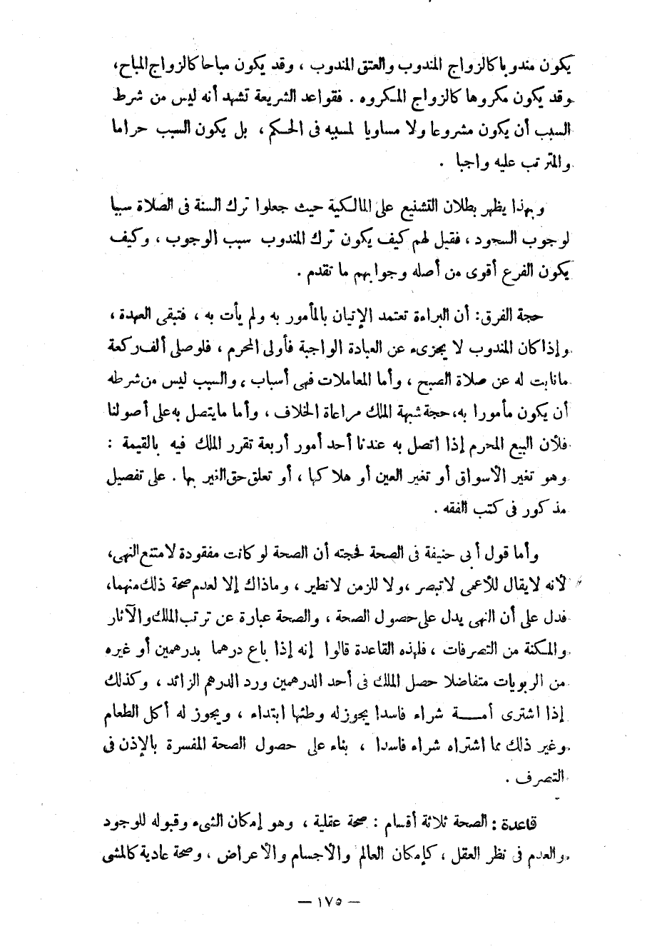حجة الفرق: أن البراءة تعتمد الإتيان بالمأمور به ولم يأت به، فتبقى العهدة، وإذا كان المندوب لا يجزئ عن العبادة الواجبة فأولى المحرم، فلو صلى ألف ركعة ما نابت عن صلاة الصبح، وأما المعاملات فهي أسبا، والسبب ليس من شرطه أن يكون مأموراً به، حجة شبهة الملك مراعاة الخلاف، وأما ما يتصل به على أصولنا فلأن البيع المحرم إذا اتصل به عندنا أحد أمور أربعة تقرر الملك فيه بالقيمة: وهو تغير الأسواق أو تغير العين أو هلاكها، أو تعلق حق الغير بها على تفصيل مذكور في كتب الفقه.