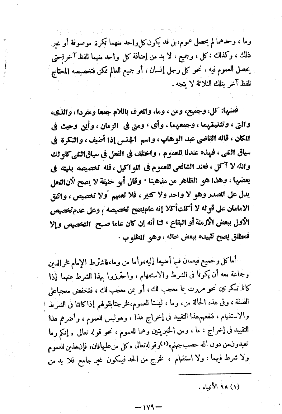 أما كلّ وجميع فيعمان فيما أضيفا إليه، وأما من وما، فاشترط الإمامان فخر الدين وجماعة معه أن يكونا في الشرط والاستفهام، واحترزوا بهذا الشرط عنهما إذا كانا نكرتين نحو مررت بما معجب لك، أو بمن معجب لك، فتخفض معجباً على الصفة، وفي هذه الحالة من، وما، ليستا للعموم، فخرجتا بقولهم إذا كانتا في الشرط والاستفهام، فنفعهم هذا التقييد في إخراج هذا. وهو ليس للعموم، وأضرهم هذا التقييد في إخراج: ما، ومن الخبريتين وهما للعموم، نحو قوله تعالى: «إنكم وما تعبدون من دون الله حصب جهنم (¬1) » ، وقوله تعالى: «كلّ من عليها فان» فإن هذين للعموم ولا شرط فيهما، ولا استفهام، فخرج من الحد فيكون غير جامع فلا بد من