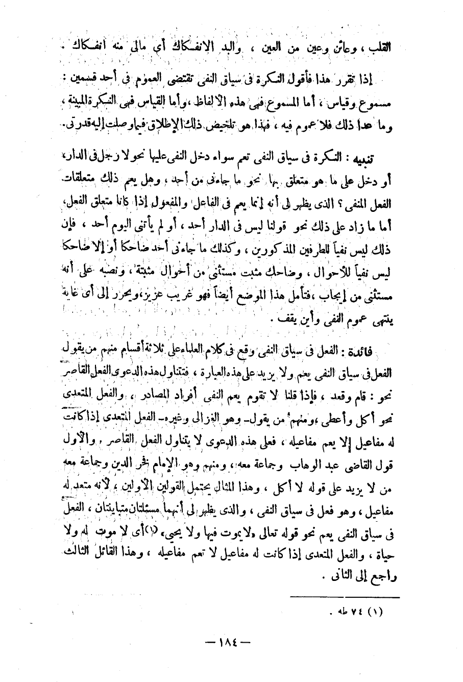 تنبيه: النكرة في سياق النفي تعم سواء دخل النفي عليها نحو لا رجل في الدار، أو دخل على ما هو متعلق بها نحو ما جاءني من أحد، وهل يعم ذلك متعلقات الفعل المنفي؟ الذي يظهر لي أنه إنّما يعم في الفاعل والمفعول إذا كانا متعلق الفعل، أما ما زاد على ذلك نحو قولنا ليس في الدار أحد أو لم يأتني اليوم أحد، فإن ذلك ليس نفياً للطرفين المذكورين، وكذلك ما جاءني أحد ضاحكاً وإلا ضاحكاً ليس نفياً للأحوال، وضاحك مثبت مستثنى من أ؛ وال مثبتة، ونصبه على أنه مستثنى من إيجاب، فتأمل هذا الموضع أيضاً فهو غريب عزيز، ويحرر إلى أي غاية ينتهي عموم النفي وأين يقف.