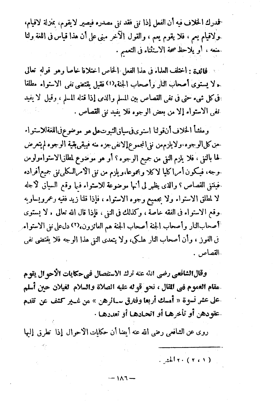 ومنشأ الخلاف أن قولنا استوى في سياق الثبوت هل هو موضوع في اللغة للاستواء من كلّ الوجوه، ولا يلزم من نفي المجموع إلاّ نفي جزء منه فيبقى بقية الوجوه لم يتعرض لها بالنفي، فلا يلزم النفي من جميع الوجوه، أو هو موضوع لمطلق الاستواء ولو من وجه، فيكون أمراً كلياً لا كلاً ومجموعاً، ويلزم من نفي الأمر الكليّ نفي جميع أفراده فينتفي القصاص؟ والذي يظهر لي أنها موضوعة للاستواء فيما وقع السياق لأجله لا لمطلق الاستواء في الفقه خاصة، وكذلك فيا لنفي، فإذا قال الله تعالى: «لا يستوي أصحاب النار وأصحاب الجنة أصحاب الجنة هم الفائزون» (¬2) ، دل على نفي الاستواء في الفوز، وأن أصحاب النار هلكى، ولا يتعدى النفي هذا الوجه فلا يقتضي نفي القصاص.