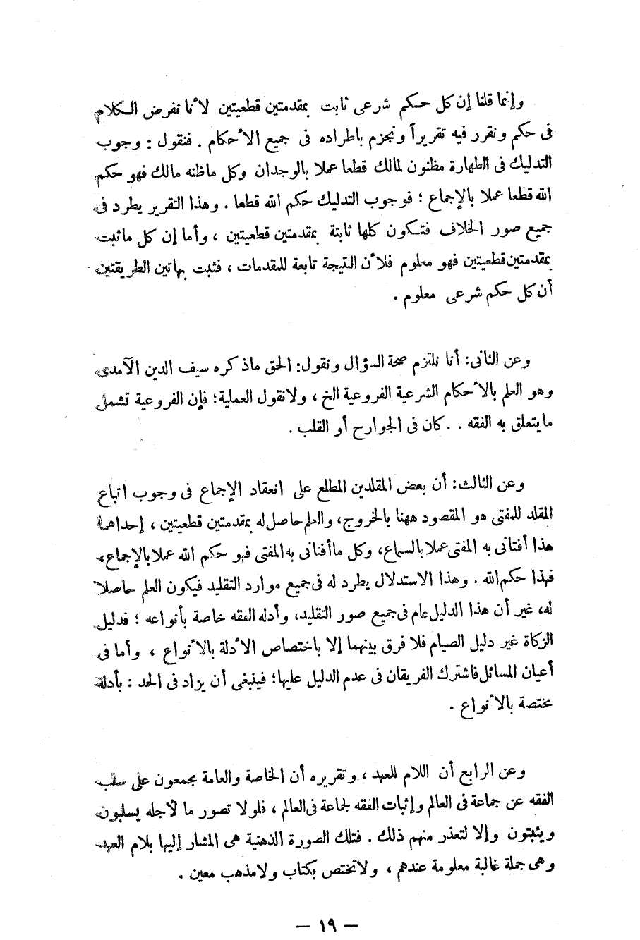وعن الثالث: أن بعض المقلدين المطلع على انعقاد الإجماع في وجوب اتباع المقلد للمفتى هو المقصود هنا بالخروج، والعلم حاصل له بمقدمتين قطعيتين، إحداهما هذا أفتاني به المفتي عملاً بالسماع، وكل ما أفتاني به المفتي فهو حكم الله عملاً بالإجماع، فهذا حكم الله. وهذا الاستدلال يطرد له في جميع موارد التقليد فيكون العلم حاصلاً له، غير أن هذا الدليل عام في جميع صور التقليد، وأدله الفقه خاصة بأنواعه؛ فدليل الزكاة غير دليل الصيام فلا فرق بينهما إلا باختصاص الأدلة بالأنواع، وأما في أعيان المسائل فاشترك الفريقان في عدم الدليل عليها؛ فينبغي أن يزاد في الحد: بأدلة مختصة بالأنواع.