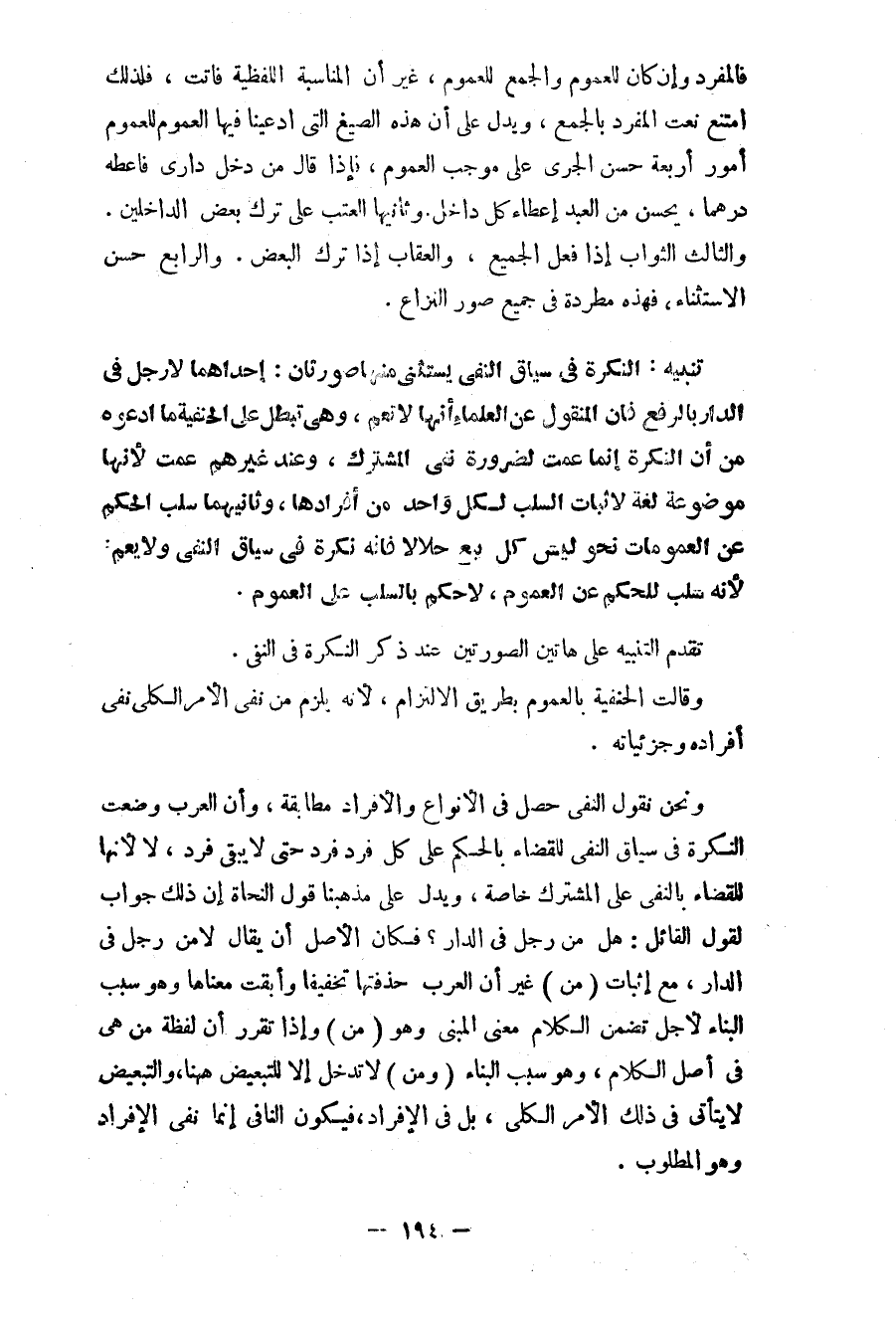 ونحن نقول النفي حصل في الأنواع والأفراد مطابقة، وأن العرب وضعت النكرة في سياق النفي للقضاء بالحكم على كلّ فرد فرد حتى لا يبقى فرد، لا لأنها لقول القائل: هل من رجل في الدار؟ فكان الأصل أن يقال لا من رجل في الدار، مع إثبات (من) غير أن العرب حذفتها تخفيفاً وأبقت معناها وهو سبب البناء لأجل تضمن الكلام معنى المبني وهو (من) وإذا تقرر أن لفظة من هي في أصل الكلام، وهو سبب البناء (ومن) لا تدخل إلاّ للتبعيض هنا، والتبعيض لا يتأتى في ذلك الأمر الكليّ، بل في الإفراد، فيكون النافي إنّما نفي الإفراد وهو المطلوب.