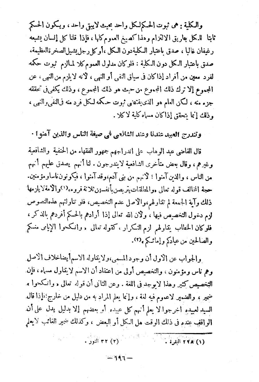 والجواب عن الأوّل أن وجود المسمى، ولا يتناوله الاسم أيضاً خلاف الأصل وهم ناس ومؤمنون، والتخصيص أولى من اعتقاد أن الاسم لا يتناول مسماه، فإن التخصيص كثير وهذا لا يوجد في اللغة. وعن الثاني أن قوله تعالى: «وانكحوا» ضمير، والضمير لا عموم فيه لغة، وإنما يعلم المراد به من دليل من خارج؛ فإذا قال السيد لعبيده اخرجوا لا يعلم أنهم كلّ عبيده أو بعضهم إلاّ بدليل يدل على أن الواقف عنده في ذلك الوقت هل الكل أو البعض، وكذلك ضمير الغائب لا يعلم