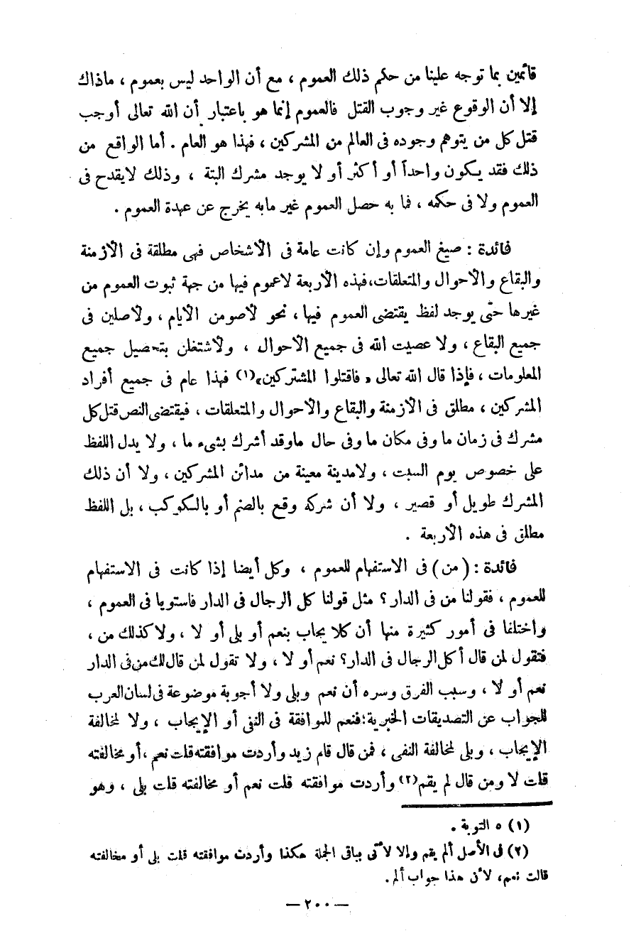 قائمين بما توجه علينا من حكم ذلك العموم، مع أن الواحد ليس بعموم، ما ذاك إلاّ أن الوقوع غير وجوب القتل فالعموم إنّما هو باعتبار أن الله تعالى أوجب قتل كلّ من يتوهم وجوده في العالم من المشركين، فهذه هو العام. أما الواقع من ذلك فقد يكون واحداً أو أكثر أو لا يوجد مشرك البتة، وذلك لا يقدح في العموم ولا في حكمه، فما به حصل العموم غير ما به يخرج عن عهدة العموم.