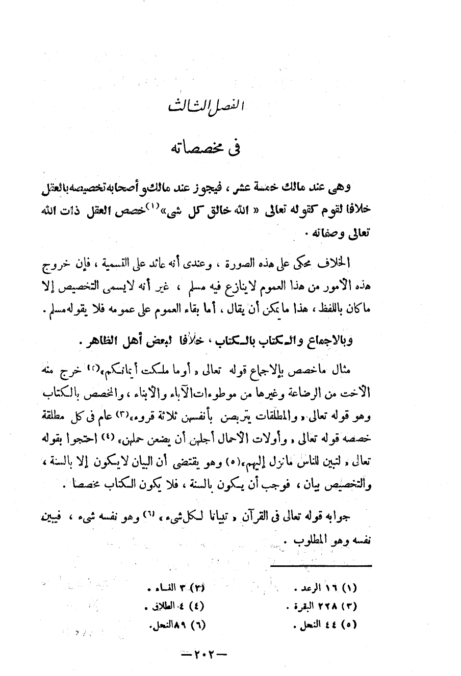 مثال ما خصص بالإجماع قوله تعالى: «أو ما ملكت أيمانكم» (¬2) خرج منه الأخت من الرضاعة وغيرها من مؤطوءات الآباء والأبناء، والمخصص بالكتاب وهو قوله تعالى: «والمطلقات يتربصن بأنفسهن ثلاثة قروء» (¬3) عام في كلّ مطلقة خصصه قوله تعالى: «وأولات الأحمال أجلهن أن يضعن حملهن» (¬4) احتجوا بقوله تعالى: «لنبين للناس ما نزل إليهم» (¬5) وهو يقتضي أن البيان لا يكون إلاّ بالسنة، والتخصيص بيان، فوجب أن يكون بالسنة فلا يكون الكتاب مخصصاً.