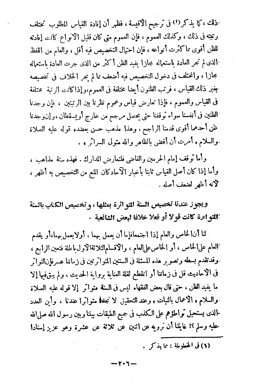 لنا أن الخاص والعام إذا اجتمعا فإما أن يعمل بهما، أو لا يعمل بهما، أو يقدم العام على الخاص، أو الخاص على العام، والأقسام الثلاثة الأوّل باطلة فتعين الرابع، وقد تقدم بسطه وتصوير هذه المسألة في السنتين المتواترتين في زماننا عسر فإن التواتر في الأحاديث قل في زماننا أو انقطع لقلة العناية برواية الحديث، ولم يبق فيها إلاّ ما يفيد الظن، حتى قال بعض الفقهاء ليس في السنة متواتر إلاّ قوله عليه الصلاة والسلام: «الأعمال بالنيات» ، وعند التحقيق لا نجده متواتراً عندنا، وأين العدد الذي يستحيل تواطؤهم على الكذب في جميع الطبقات بيننا وبين رسول الله - صلى الله عليه وسلم -؟! غايتنا أن نرويه عن اثنين عن ثلاثة عن عشرة وهو عزيز إسناداً