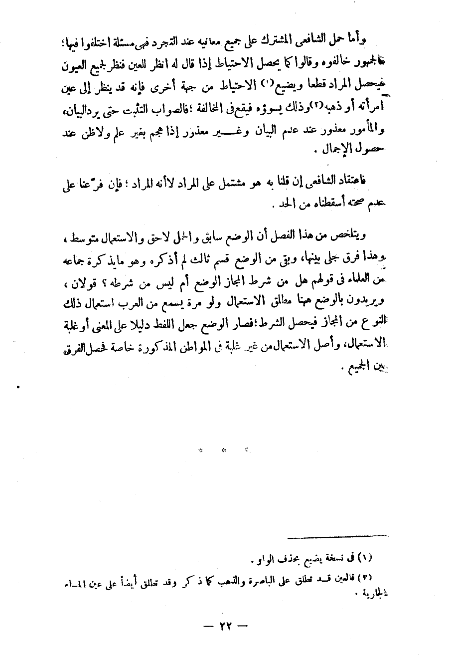 وأما حمل الشافعي المشترك على جميع معانيه عند التجرد فهي مسألة اختلفوا فيها؛ فالجمهور خالفوه وقالوا كما يحصل الاحتياط إذا قال له انظر للعين فنظر لجميع العيون فيحصل المراد قطعاً ويضيع الاحتياط (¬1) من جهة أخرى فإنه قد ينظر إلى عين امرأته أو ذهب (¬2) وذلك يسوؤه فيقع في المخالفة؛ فالصواب التثبت حتى يرد البيان، والمأمور معذور عند عدم البيان وغير معذور إذا هجم بغير علم ولا ظن عند حصول الإجمال.