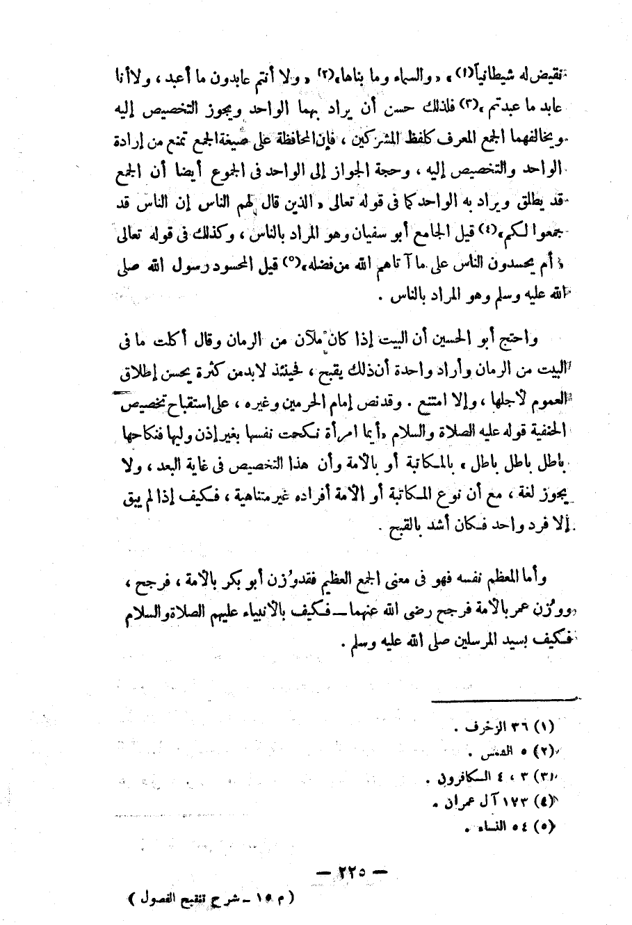 نقيض له شيطاناً» (¬1) ، «والسماء وما بناها» (¬2) ، «ولا أنتم عابدون ما أعبد، ولا أنا عابد ما عبدتم» (¬3) فلذلك حسن أن يراد بهما الواحد ويجوز التخصيص إليه ويخالفهما الجمع المعرف كلفظ المشركين، فإن المحافظة على صيغة الجمع تمنع من إرادة الواحد والتخصيص إليه، وحجة الجواز إلى الواحد في الجموع أيضاً أن الجمع قد يطلق ويراد به الواحد كما في قوله تعالى: «الذين قال لهم الناس إن الناس قد جمعوا لكم» (¬4) قيل الجامع أبو سفيان وهو المراد بالناس، وكذلك في قوله تعالى: «أم يحسدون الناس على ما آتاهم الله من فضله» (¬5) قيل المحسود رسول الله - صلى الله عليه وسلم - وهو المراد بالناس.