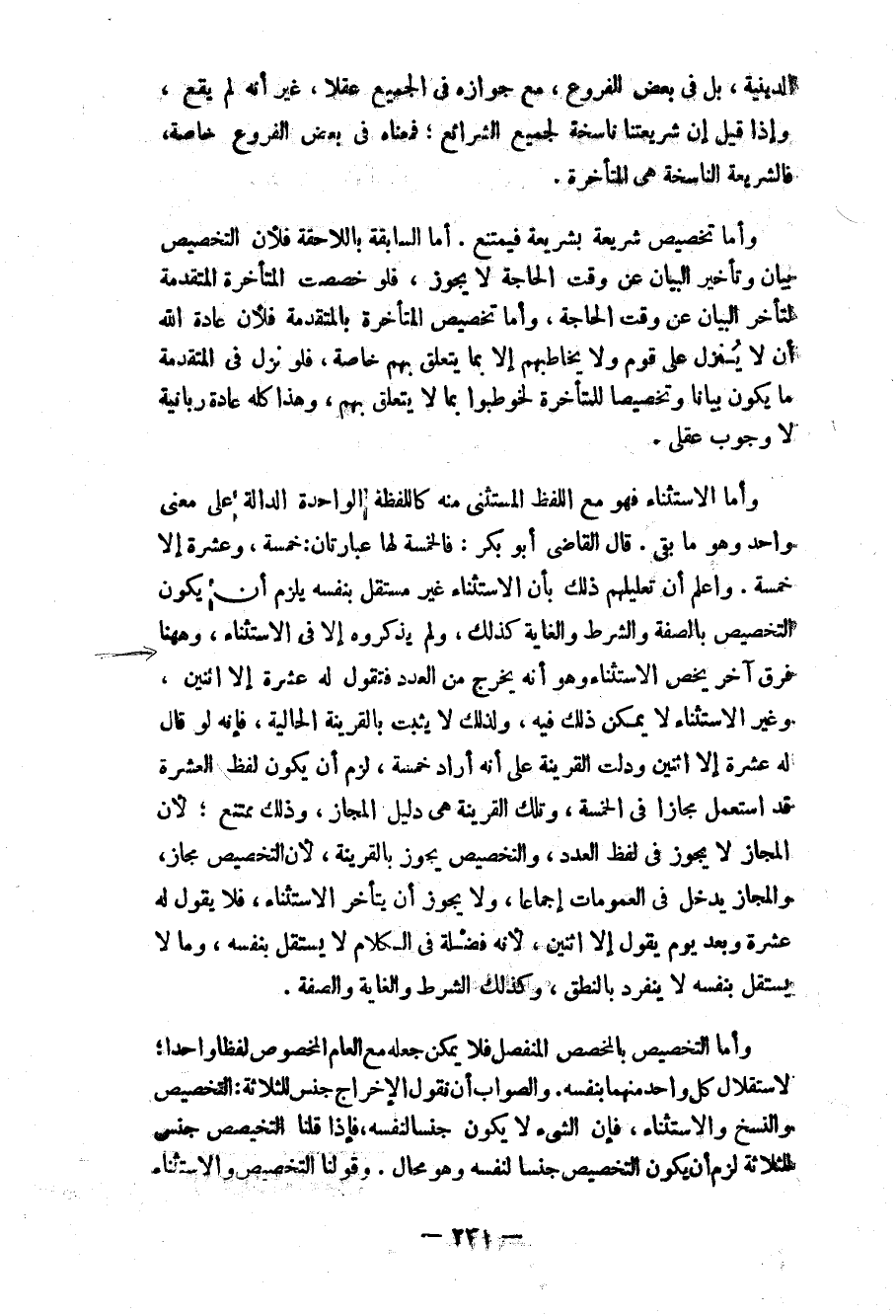 وأما التخصيص بالمخصص المنفصل فلا يمكن جعله مع العام المخصوص لفظاً واحداً؛ لاستقلال كلّ واحد منهما بنفسه. والصواب أن تقول الإخراج جنس للثلاثة: التخصيص والنسخ والاستثناء، فإن الشيء لا يكون جنساً لنفسه، فإذا قلنا التخصيص جنسي للثلاثة لزم أن يكون التخصيص جنساً لنفسه وهو محال. وقولنا التخصيص والاستثناء