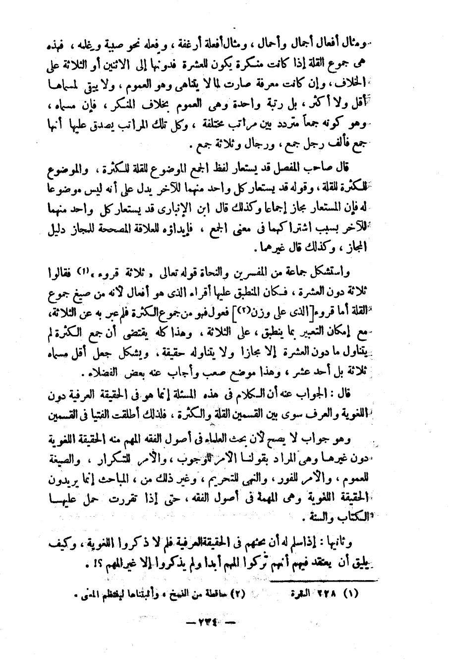 واستشكل جماعة من المفسرين والنحاة قوله تعالى: «ثلاثة قروء» (¬1) فقالوا ثلاثة دون العشرة، فكان المنطبق عليها أقراء الذي هو أفعال لأنه من صيغ جموع القلة أما قروء [الذي على وزن (¬2) ] فعول فهو من جموع الكثرة فلم يعبر به عن الثلاثة، مع إمكان التعبير بما ينطبق على الثلاثة، وهذا كله يقتضي أن جمع الكثرة لم يتناول ما دون العشرة إلاّ مجازاً ولا يتناوله حقيقة، ويشكل جعل أقل مسماه ثلاثة بل أحد عشر، وهذا موضع صعب وأجاب عنه بعض الفضلاء.