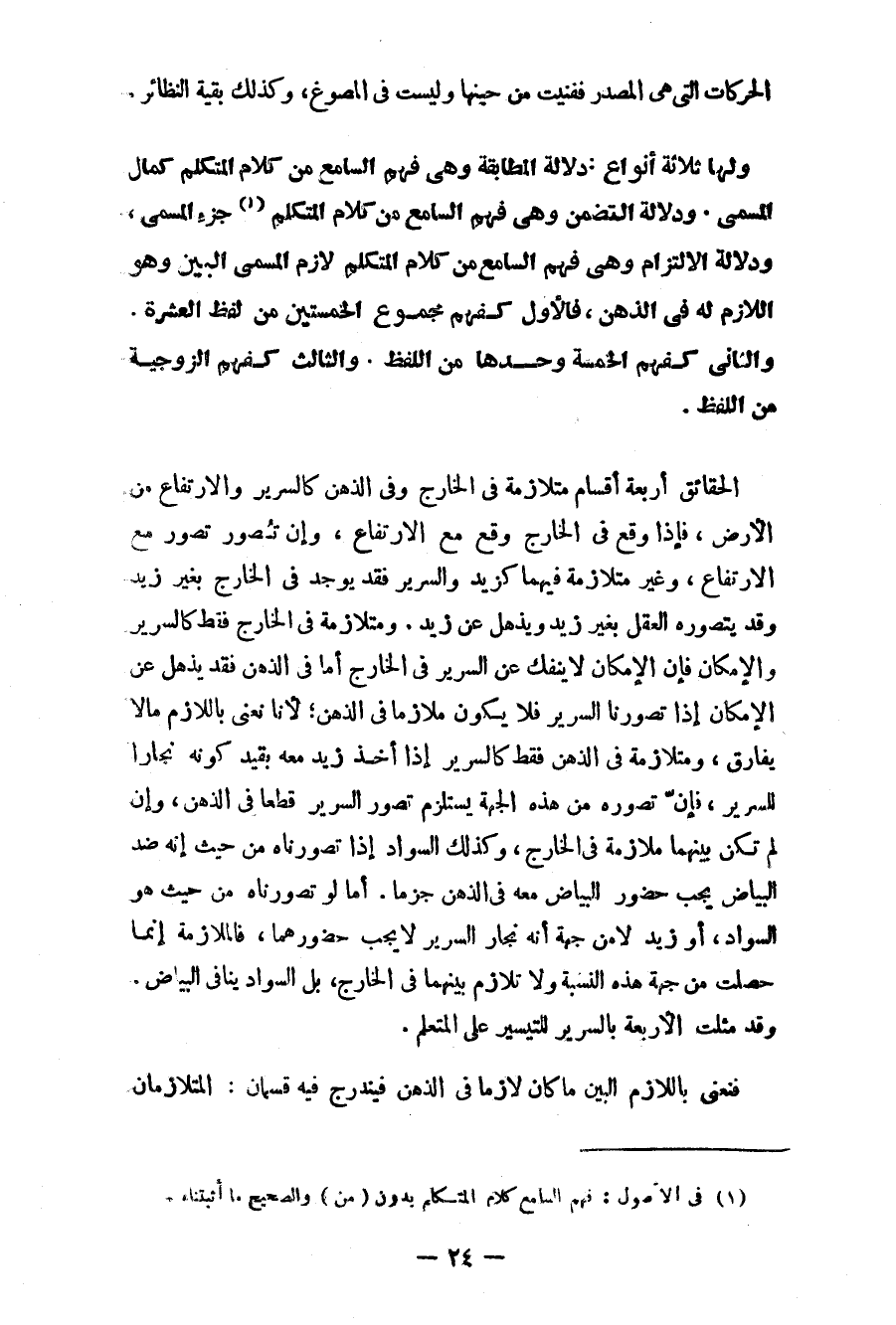 الحقائق أربعة أقسام متلازمة في الخارج وفي الذهن كالسرير والارتفاع من الأرض، فإذا وقع في الخارج وقع مع الارتفاع، وإن تُصور تصور مع الارتفاع، وغير متلازمة فيهما كزيد والسرير فقد يوجد في الخارج بغير زيد وقد يتصوره العقل بغير زيد ويذهل عن زيد. ومتلازمة في الخارج فقط كالسرير والإمكان فإن الإمكان لا ينفك عن السرير فيا لخارج أما في الذهن فقد يذهل عن الإمكان إذا تصورنا السرير فلا يكون ملازماً في الذهن؛ لأنا نعني باللازم ما لا يفارق، ومتلازمة في الذهن فقط كالسرير إذا أخذ زيد معه بقيد كونه نجاراً للسرير، فإنَّ تصوره من هذه الجهة يستلزم تصور السرير قطعاً في الذهن، وإن لم تكن بينهما