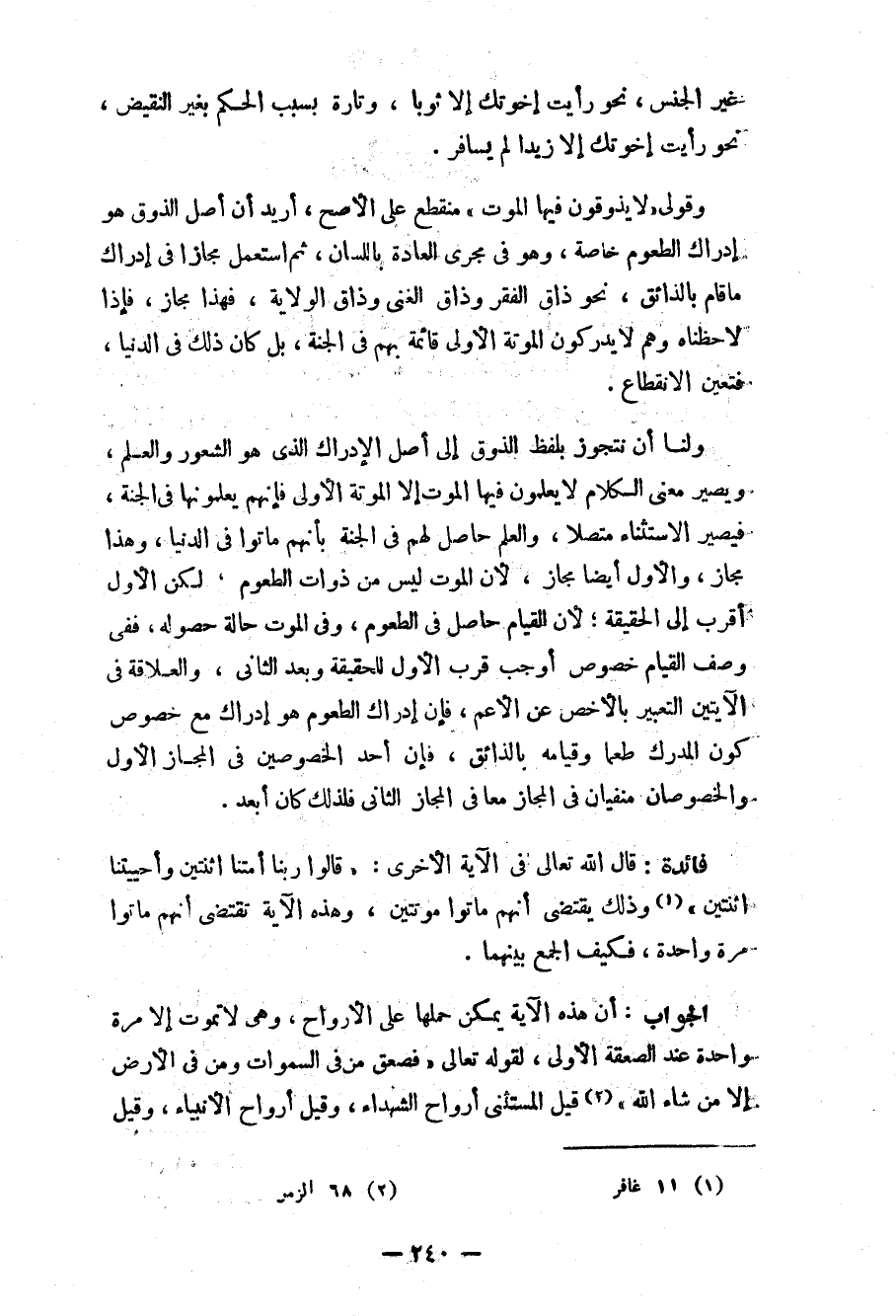 ولنا أن نتجوز بلفظ الذوق إلى أصل الإدراك الذي هو الشعور والعلم، ويصير معنى الكلام لا يعلمون فيها الموت إلاّ الموتة الأولى فإنهم لا يعلمونها في الجنة، فيصير الاستثناء متصلاً، والعلم حاصل لهم في الجنة بأنهم ماتوا في الدنيا، وهذا مجاز، والأول أيضاً مجاز، لأن الموت ليس من ذوات الطعوم، لكن الأوّل أقرب إلى الحقيقة؛ لأن القيام حاصل في الطعوم، وفي الموت حالة حصوله، ففي وصف القيام خصوص أوجب قرب الأوّل للحقيقة وبعد الثاني، والعلاقة في الآيتين التعبير بالأخص عن الأعم، فإن إدراك الطعوم هو إدراك مع خصوص كون المدرك طعماً وقيامه بالذائق، فإن أحد الخصوصين في المجاز الأوّل بالخصوصان منفيان في المجاز معاً في المجاز الثاني فلذلك كان أبعد.