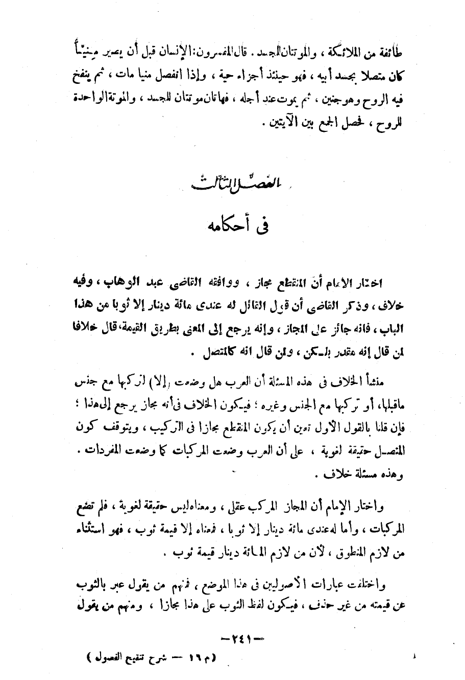 واختار الإمام أن المجاز المركب عقلي، ومعناه ليس حقيقة لغوية، فلم تضع المركبات، وأما له عندي مائة دينار إلاّ ثوباً، فمعناه إلاّ قيمة ثوب، فهو استثناء من لازم المنطوق، لأن من لازم المائة دينار قيمة ثوب.