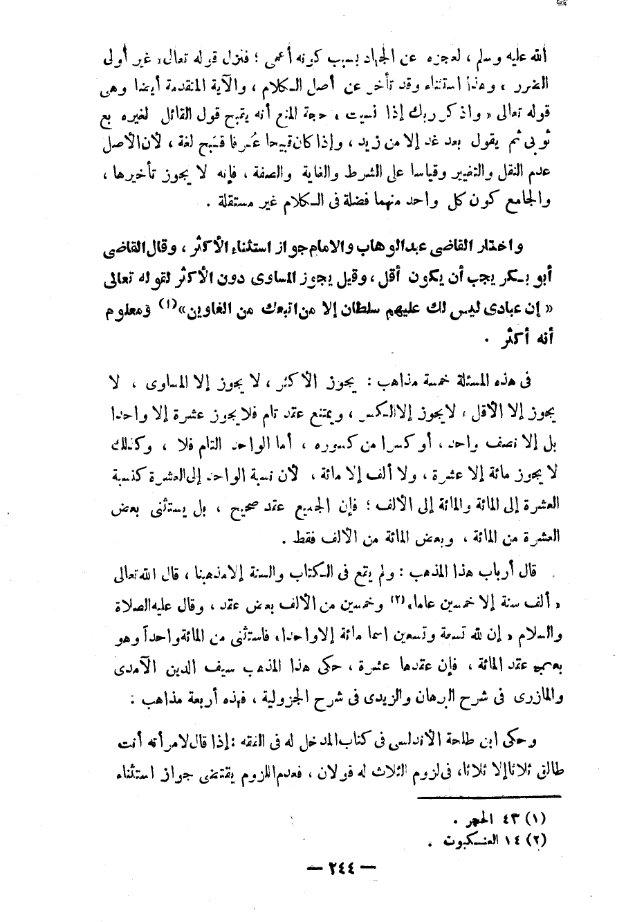 قال أرباب هذا المذهب: ولم يقع في الكتاب والسنة إلاّ مذهبنا، قال الله تعالى: «ألف سنة إلاّ خمسين عاماً» (¬2) وخمسين من الألف بعض عقد، وقال عليه الصلاة والسلام «إن لله تسعة وتسعين اسماً مائة إلاّ واحداً» فاستثنى من المائة واحداً وهو بعض عقد المائة، فإن عقدها عشرة، حكى هذا المذهب سيف الدين الآمدي والمازري في شرح البرهان والزيدي في شرح الجزولية، فهذه أربعة مذاهب.