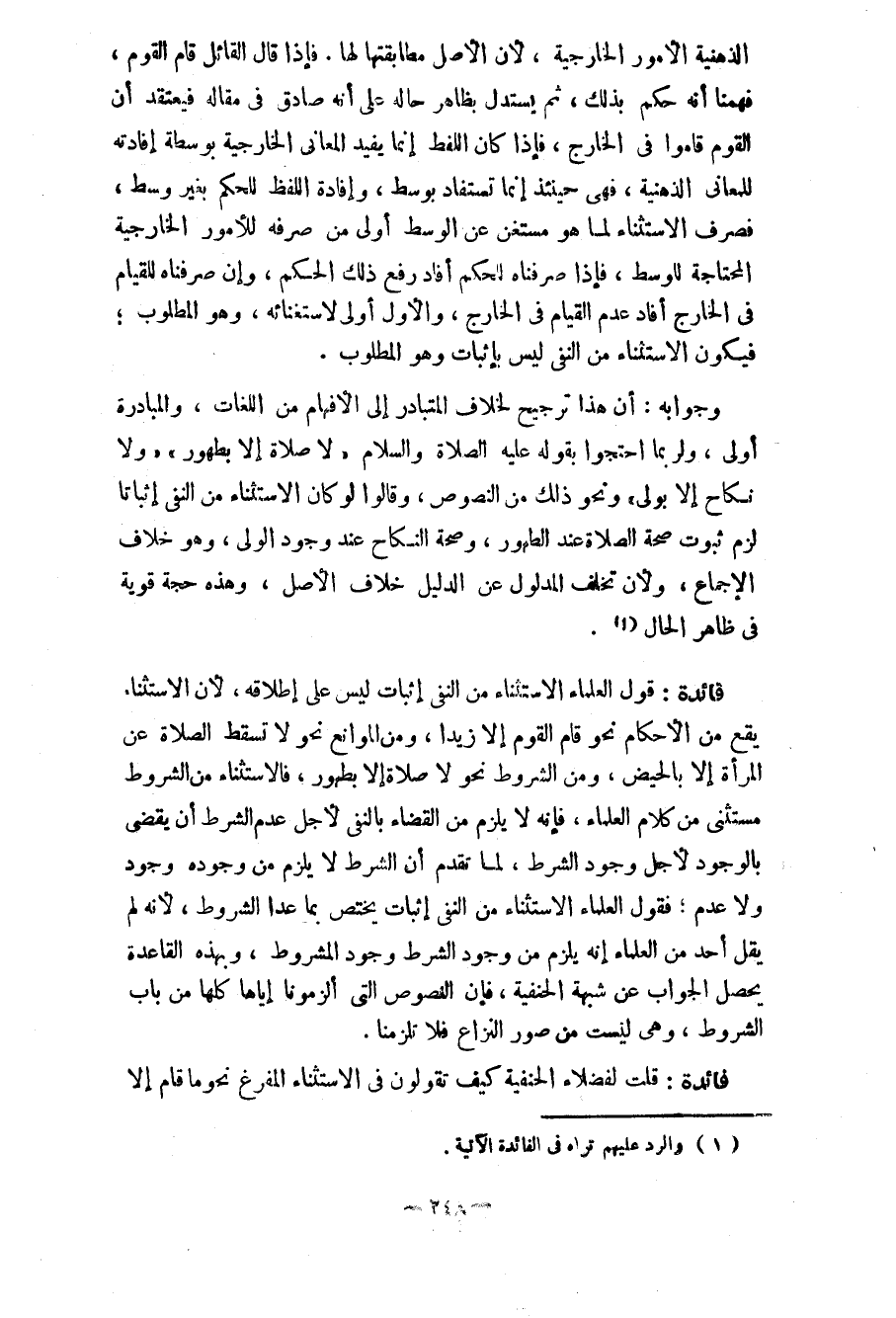 فائدة: قول العلماء الاستثناء من النفي إثبات ليس على إطلاقهن لأن الاستثناء يقع من الأحكام نحو قام القوم إلاّ زيداً، ومن الموانع نحو لا تسقط الصلاة عن المرأة إلاّ بالحيض، ومن الشروط نحو لا صلاة إلاّ بطهور، فالاستثناء من الشروط مستثنى من كلام العلماء، فإنه لا يلزم من القضاء بالنفي لأجل عدم الشرط أن يقضى بالوجود لأجل وجود الشرط، لما تقدم أن الشرط لا يلزم من وجوده وجود ولا عدم؛ فقول العلماء الاستثناء من النفي إثبات يختص بما عدا الشروط، لأنه لم يقل أحد من العلماء أنه يلزم من وجود الشروط وجود المشروط، وبهذه القاعدة يحصل الجواب عن شبهة الحنفية، فإن النصوص التي ألزمونا إياها كلها من باب الشروط، وهي ليست من صور النزاع فلا تلزمنا.