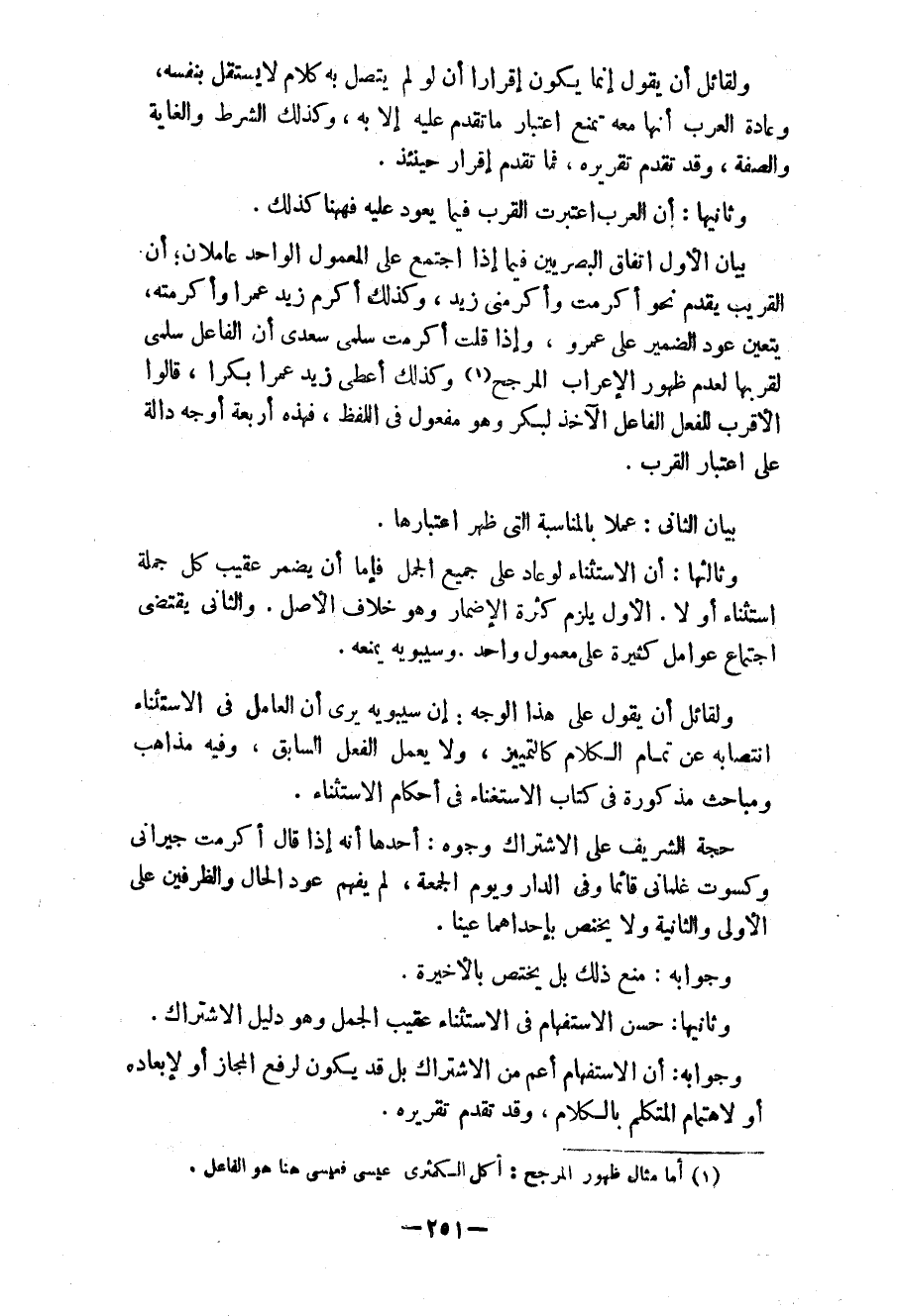 وثالثها: أن الاستثناء لو عاد على جميع الجمل فإما أن يضمر عقيب كلّ جملة استثناء أو لا. الأوّل يلزم كثرة الإضمار وهو خلاف الأصل. والثاني يقتضي اجتماع عوامل كثيرة على معمول واحد. وسيبويه يمنعه.