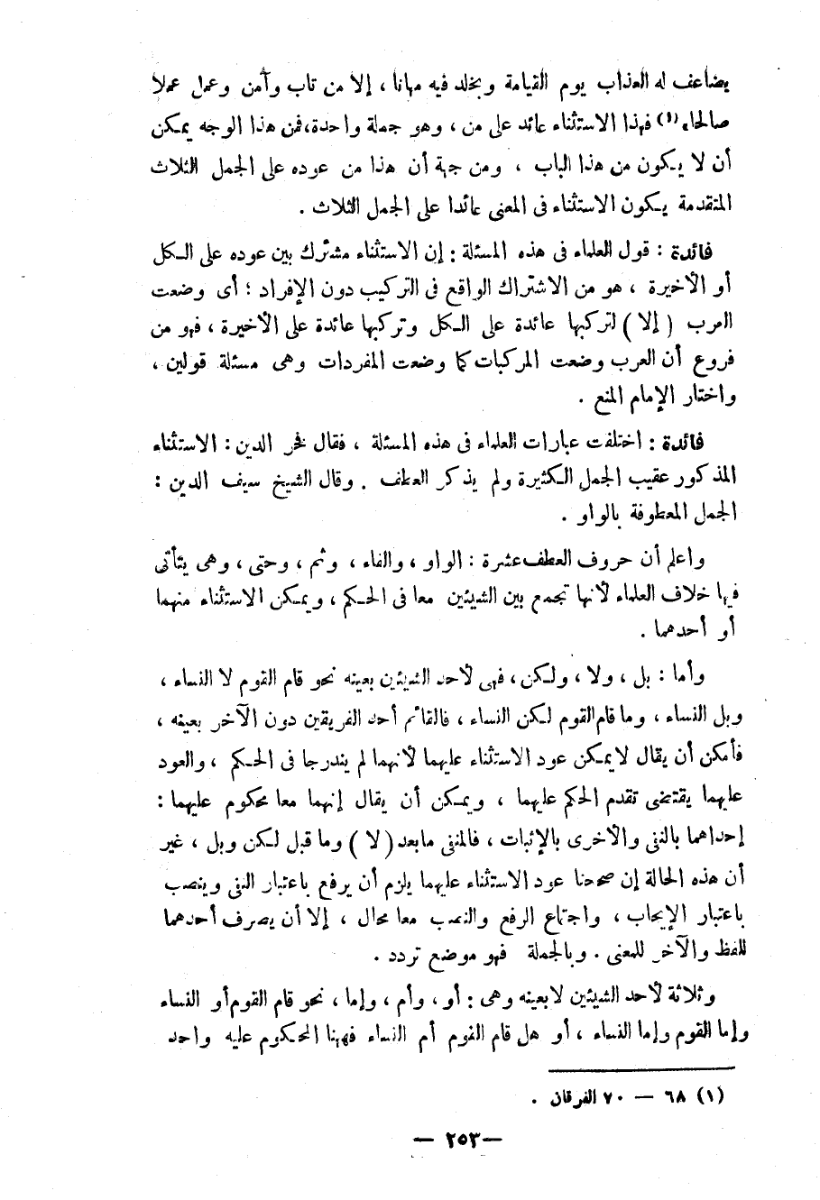 يضاعف له العذاب يوم القيامة ويخلد فيه مهانا، إلاّ من تاب وآمن وعمل عملاً صالحاً» (¬1) فهذا الاستثناء عائد على من، وهو جملة واحدة، فمن هذا الوجه يمكن أن لا يكون من هذا الباب، ومن جهة أن هذا من عوده على الجمل الثلاث المتقدمة يكون الاستثناء في المعنى عائداً على الجمل الثلاث.