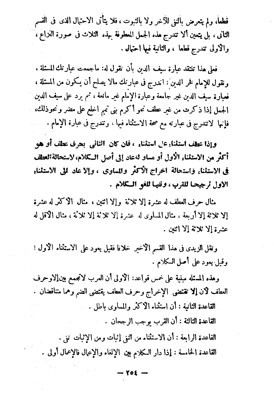 وهذه المسألة مبنية على خمس قواعد: الأولى أن العرب لا تجمع بين إلاّ وحرف العطف لأن إلاّ تقتضي الإخراج وحرف العطف يقتضي الضم وهما متناقضان.