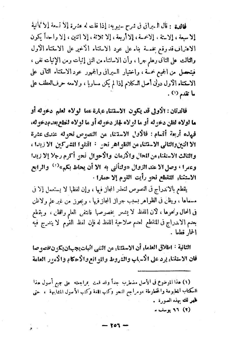 فائدتان: الأولى قد يكون الاستثناء عبارة عما لولاه لعلم دخوله أو ما لولاه لظن دخوله أو ما لولاه لجاز دخوله أو ما لولاه لقطع بعدم دخوله، فهذه أربعة أقسام: فالأول استثناء من النصوص نحو له عندي عشرة إلاّ اثنين والثاني الاستثناء من الظواهر نحو: اقتلوا المشركين إلاّ زيداً، والثالث الاستثناء من المحال والأزمان والأحوال نحو أكرم رجلاً إلاّ زيداً وعمراً، وصل إلاّ عند الزوال «ولتأتنني إلاّ أن يحاط بكم» (¬2) والرابع الاستثناء المنقطع نحو رأيت القوم إلاّ حماراً.