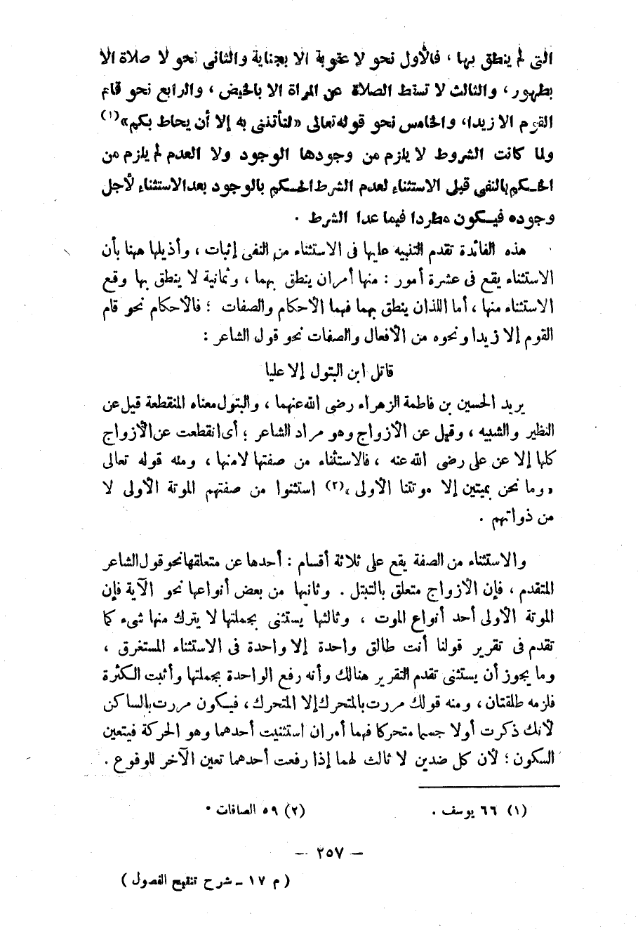والاستثناء من الصفة يقع على ثلاثة أقسام: أحدها عن متعلقها نحو قول الشاعر المتقدم، فإن الأزواج متعلق بالتبتل. وثانيها من بعض أنواعها نحو الآية فإن الموتة الأولى أحد أنواع الموت، وثالثها يستثنى بجملتها لا يترك منها شيء كما تقدم في تقرير قولنا أنت طالق إلاّ واحدة إلاّ واحدة في الاستثناء المستغرق، وما يجوز أن يستثنى تقدم التقرير هنالك وأنه رفع الواحدة في الاستثناء المستغرق، فلزمه طلقتان، ومنه قولك مررت بالمتحرك إلاّ المتحرك، فيكون مررت بالساكن لأنك ذكرت أولاً جسماً متحركاً فهما أمران استثنيت أحدهما وهو الحركة فيتعين السكون: لأن كلّ ضدين لا ثالث لهما إذا رفعت أحدهما تعين الآخر للوقوع.