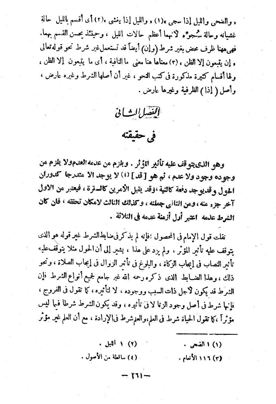 نقلت قول الإمام في المحصول؛ فإنه لم يذكر في ضابط الشرط غير قوله هو الذي يتوقف عليه تأثير المؤثر، ولم يزد على هذا، يشير إلى أن الحول مثلاً يتوقف عليه تأثير النصاب في إيجاب الزكاة، والبلوغ في تأثير الزوال في إيجاب الصلاة، ونحو ذلك، وهذا الضابط الذي ذكره رحمه الله غير جامع لجميع أنواع الشرط فإن الشرط قد يكون لأجل ذات السبب ووجوده، لا لتأثيره، كما تقول في الفروج، فإنَّها شرط في أصول وجود الزنا في تأثيره، وقد يكون الشرط شرطاً فيما ليس مؤثراً، كما تقول الحياة شرط في العلم، والعلم شرط في الإرادة، مع أن العلم غير مؤثر