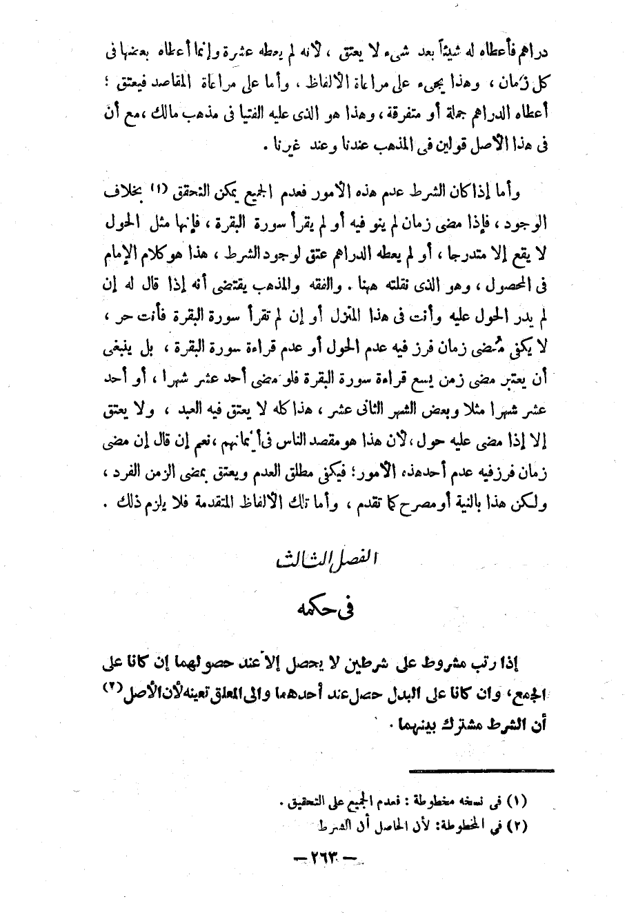 وأما إذا كان الشرط عدم هذه الأمور فعدم الجميع يمكن التحقق (¬1) بخلاف الوجود، فإذا مضى زمان لم ينو فيه أو لم يقرأ سورة البقرة، فإنَّها مثل الحول لا يقع إلاّ متدرجاً، أو لم يعطه الدراهم عتق لوجود الشرط، هذا هو كلام الإمام في المحصول، وهو الذي نقلته هنا. والفقه والمذهب يقتضي أنه إذا قال له إن لم يدر الحول عليه وأنت في هذا المنزل أو إن لم تقرأ سورة البقرة فأنت حر، لا يكفي مُضي زمان فرز فيه عدم الحول أو عدم قراءة سورة البقرة، بل ينبغي أن يعتبر مضي زمن يسع قراءة سورة البقرة فلو مضى أحد عشر شهراً، أو أحد عشر شهراً مثلاً وبعض الشهر الثاني عشر، هذا كله لا يعتق فيه العبد، ولا يعتق إلاّ إذا مضى عليه حول، لأن هذا هو مقصد الناس في أيمانهم، نعم إن قال إن مضى زمان فرز فيه عدم أحد هذه الأمور؛ فيكفي مطلق العدم ويعتق بمضي الزمن الفرد، ولكن هذا بالنية أو مصرح كما تقدم، وأما تلك الألفاظ المتقدمة فلا يلزم ذلك.