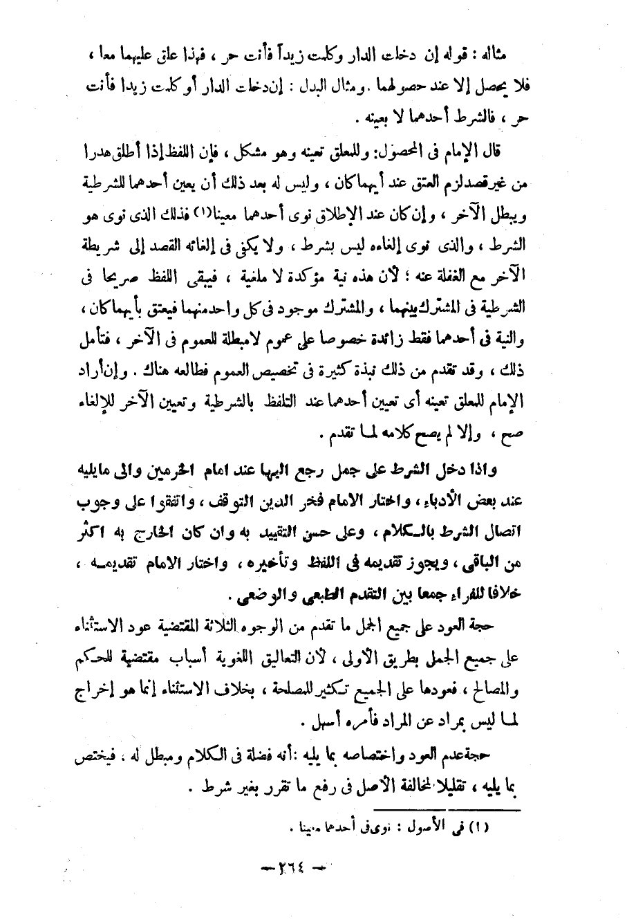 وإذا دخل الشرط على جمل رجع إليها عند إمام الحرمين وإلى ما يليه عند بعض الأدباء، واختار الإمام فخر الدين التوقف، واتفقوا على وجوب اتصال الشرط بالكلام، وعلى حسن التقييد به وإن كان الخارج به أكثر من الباقي، ويجوز تقديمه في اللفظ وتأخيره، واختار الإمام تقديمه، خلافاً للقراء جمعاً بين التقدم والطبعي والوضعي.