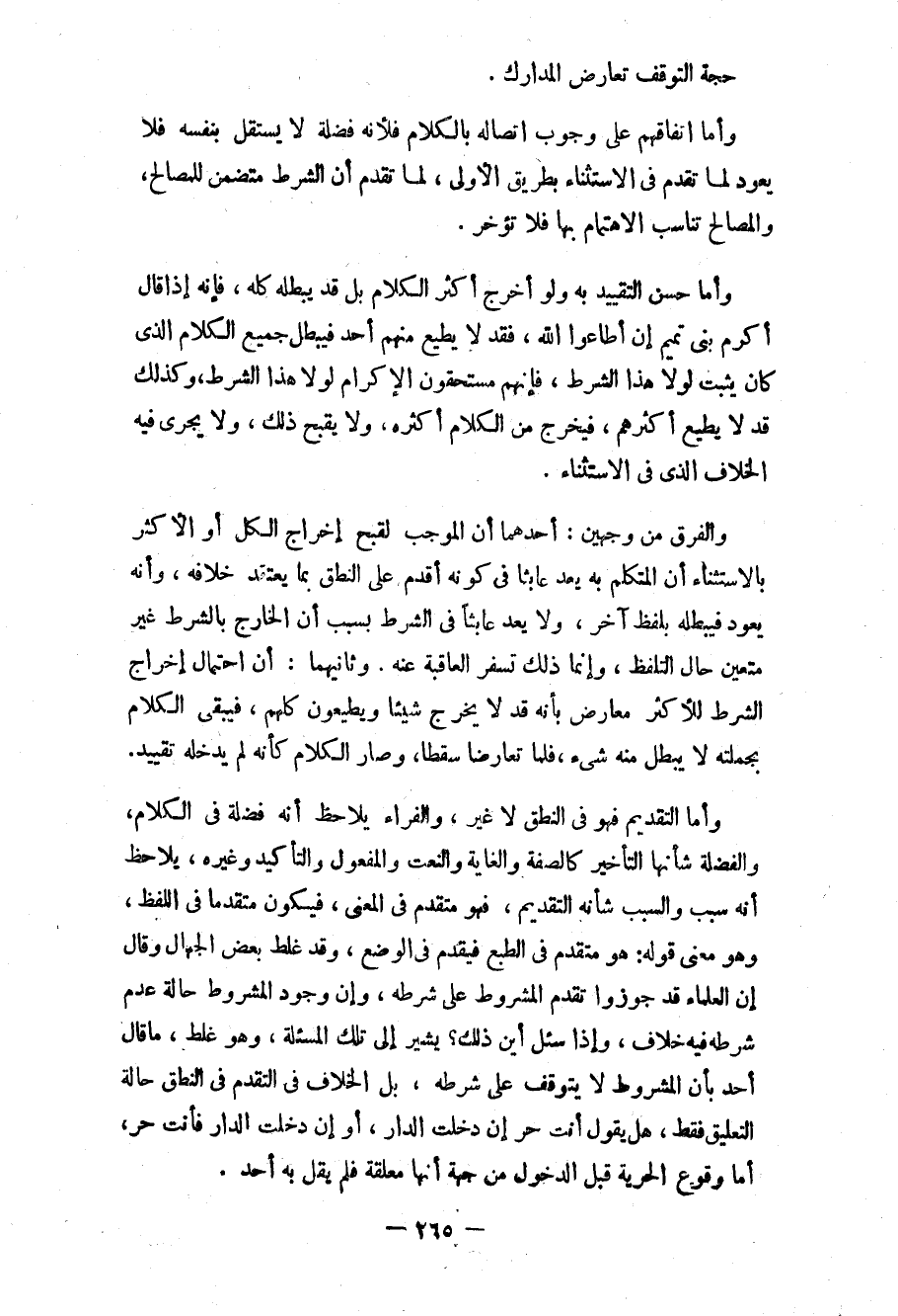 وأما حسن التقييد به ولو أخرج أكثر الكلام بل قد يبطله كله، فإنه إذا قال أكرم بني تميم إن أطاعوا الله، فقد لا يطيع منهم أحد فيبطل جميع الكلام الذي كان يثبت لولا هذا الشرط، فإنهم مستحقون الإكرام لولا هذا الشرط، وكذلك قد لا يطيع أكثرهم، فيخرج من الكلام أكثره، ولا يقبح ذلك، ولا يجري فيه الخلاف الذي في الاستثناء.
