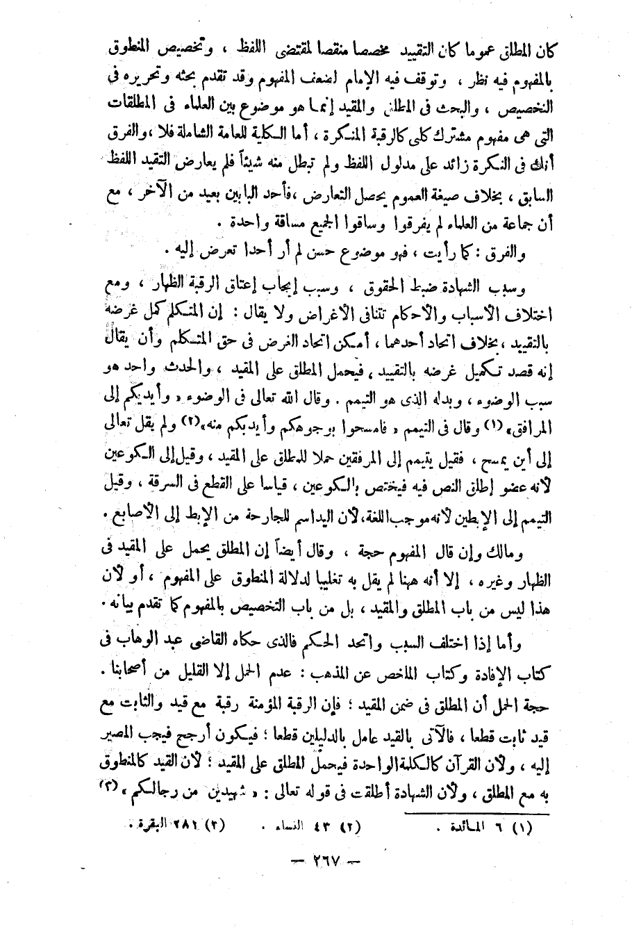 وأما إذا اختلف السبب واتحد الحكم فالذي حكاه القاضي عبد الوهاب في كتاب الإفادة وكتاب الملخص عن المذهب: عدم الحمل إلاّ القليل من أصحابنا حجة الحمل أن المطلق في ضمن المقيد؛ فإن الرقبة المؤمنة رقبة مع قيد والثابت مع قيد ثابت قطعاً، فالآتي بالقيد عامل بالدليلين قطعاً؛ فيكون أرجح فيجب المصير إليه، ولأن القرآن كالكلمة الواحدة فيحمل المطلق على المقيد؛ لأن القيد كالمنطوق به مع المطلق، ولأن الشهادة أطلقت في قوله تعالى: «شهيدين من رجالكم» (¬3)