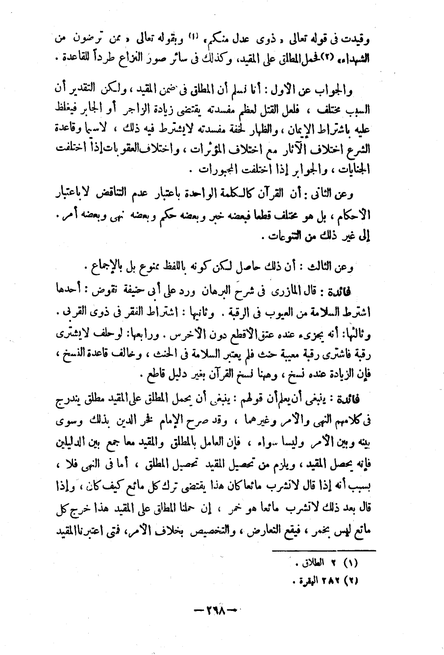 وقيدت في قوله تعالى: «ذوى عدل منكم» (¬1) وبقوله تعالى: «ممن ترضون من الشهداء» (¬2) فحمل المطلق على المقيد، وكذلك في سائر صور النزاع طرداً للقاعدة.