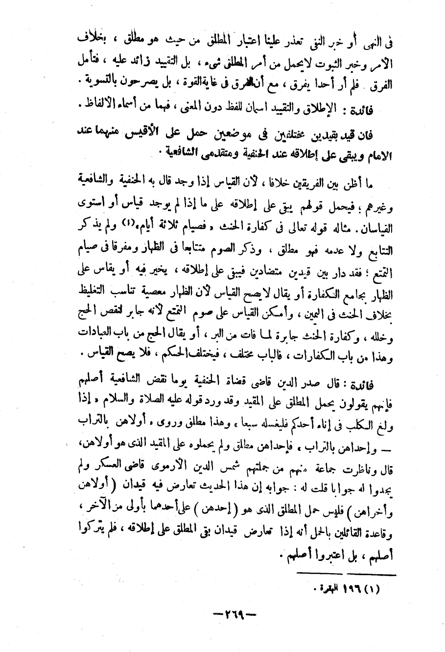 ما أظن بين الفريقين خلافاً، لأن القياس إذا وجد قال به الحنفية والشافعية وغيرهم؛ فيحمل قولهم يبقى على إطلاقه على ما إذا لم يوجد قياس أو استوى القياسان. مثاله قوله تعالى في كفارة الحنث «فصيام ثلاثة أيام» (¬1) ولم يذكر التتابع ولا عدمه فهو مطلق، وذكر الصوم متتابعاً في الظهار ومفرقاً في صيام التمتع؛ فقد دار بين قيدين متضادين فيبقى على إطلاقه، يخير فيه أو يقاس على الظهار بجامع الكفارة أو يقال لا يصح القياس لأن الظهار معصية تناسب التغليظ بخلاف الحنث في اليمين، وأمكن القياس على صوم التمتع لأنه جابر لنقص الحج وخلله، وكفارة الحنث جابرة لما فات من البر، أو يقال