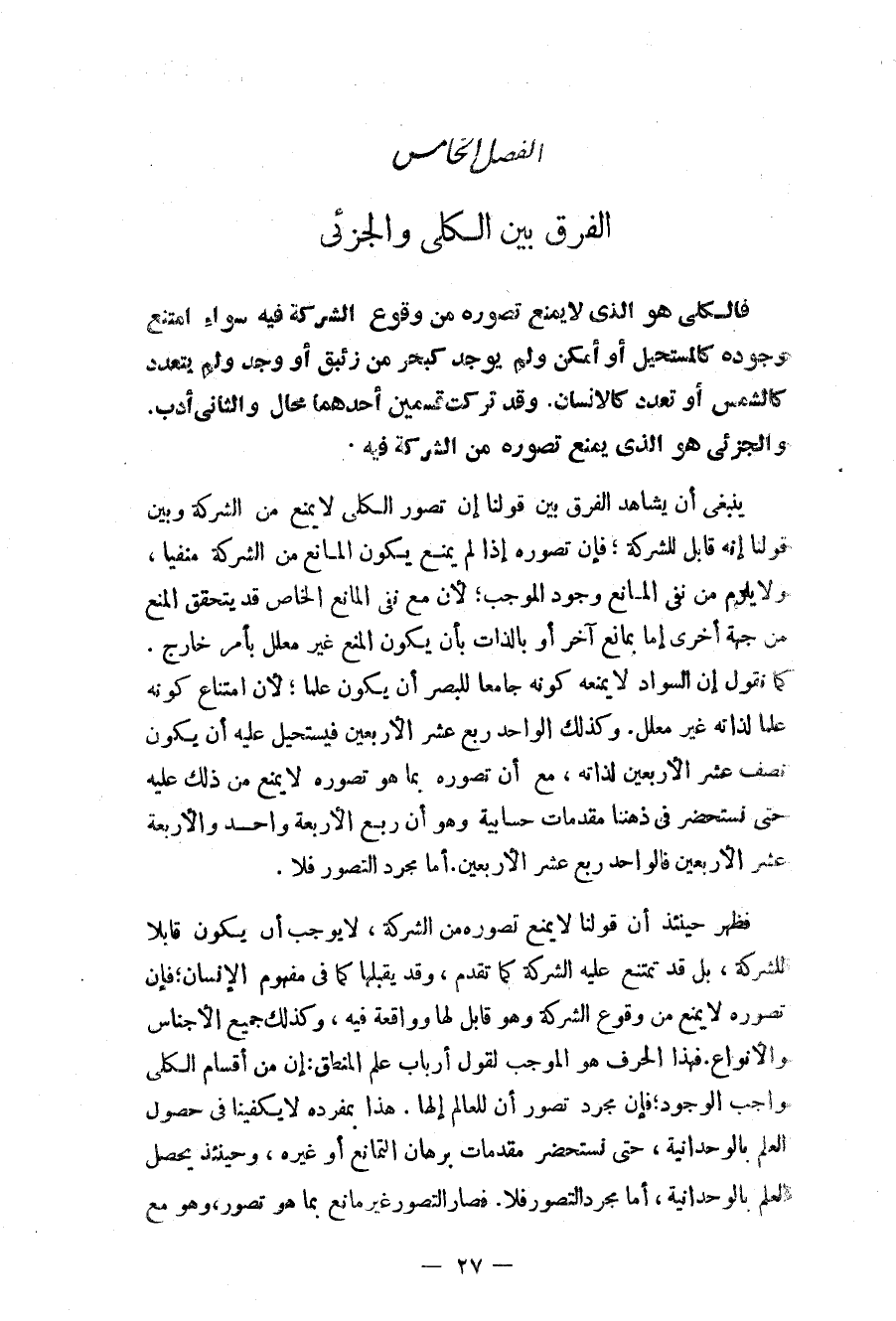 ينبغي أن يشاهد الفرق بين قولنا إن تصور الكلي لا يمنع من الشركة وبين قولنا إنه قابل للشركة؛ فإن تصوره إذا لم يمنع يكون المانع من الشركة منفياً، ولا يلزم من نفي المانع وجود الموجب؛ لأن مع نفي المانع الخاص قد يتحقق المنع من جهة أخرى إما بمانع آخر أو بالذات بأن يكون المنع غير معلل بمر خارج. كما نقول إن السواد لا يمنعه كونه جاعاً للبصر أن يكون علماً؛ لأن امتناع كونه علماً لذاته غير معلل. وكذلك الواحد ربع عشر الأربعين فيستحيل عليه أن يكون نصف عشر الأربعين لذاته، مع أن تصوره بما هو تصوره لا يمنع من ذلك عليه حتى نستحضر في ذهننا مقدمات حسابية وهو أن ربع الأربعة واحد والأربعة عشر الأربعين فالواحد ربع عشر الأربعين. أما مجرد التصور فلا.