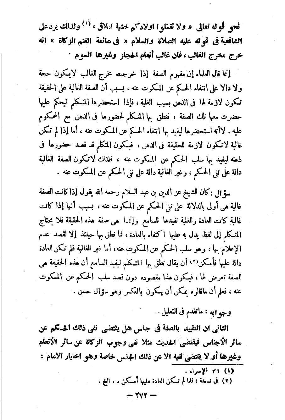 سؤال: كان الشيخ عز الدين بن عبد السلام رحمه الله يقول إذا كانت الصفة غالبة هي أولى بالدلالة على نفي الحكم عن المسكوت عنه، بسبب أنها إذا كانت غالبة كانت العادة والغلبة تفيدها للسامع وإنما هي صفة هذه الحقيقة فلا يحتاج المتكلم إلى لفظ يدل به
