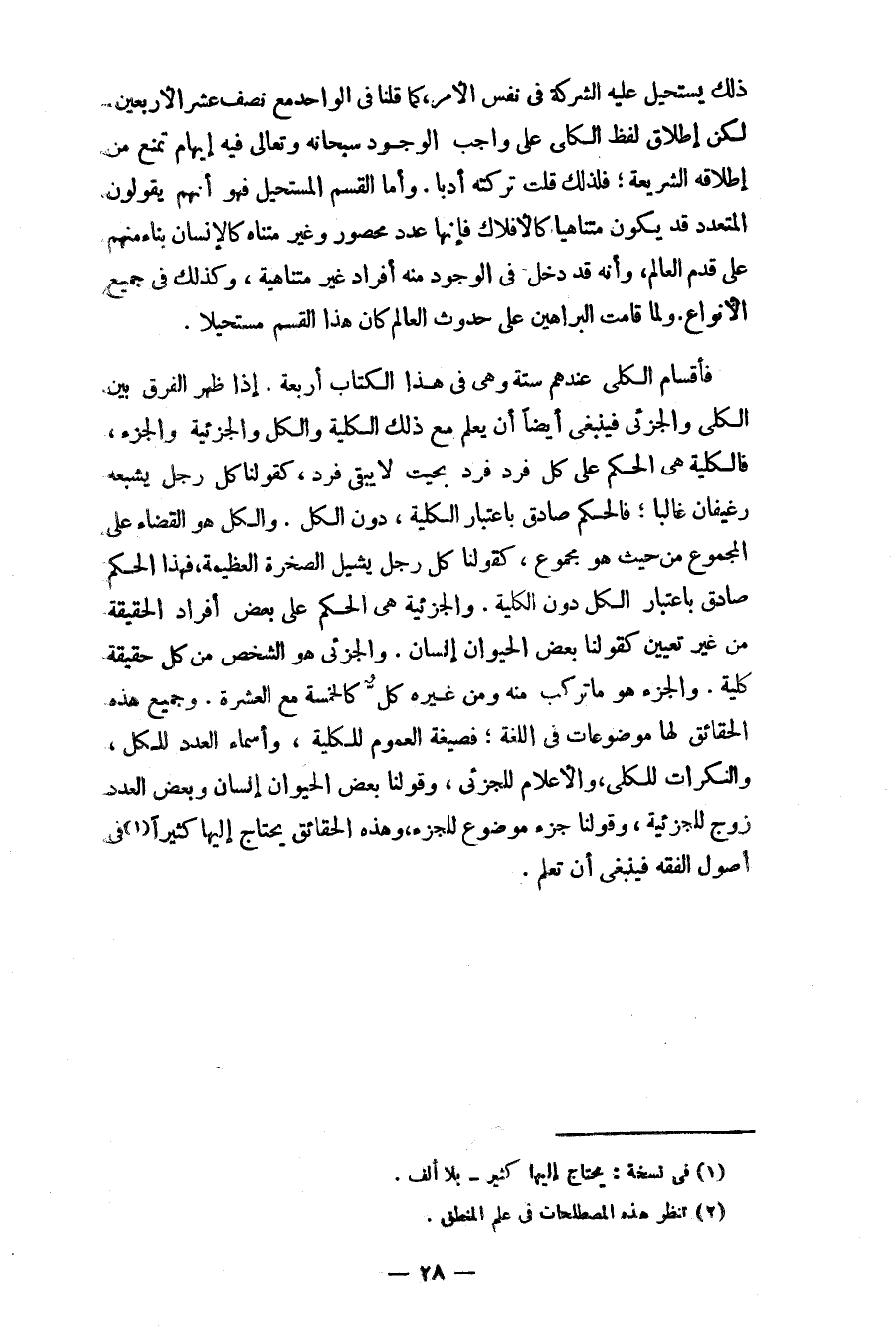 فأقسام الكلي عندهم ستة وهي في هذا الكتاب أربعة. إذا ظهر الفرق بين الكلي والجزئي فينبغي أيضاً أن يعلم مع ذلك الكلية والكلي والجزئية والجزء، فالكلية هي الحكم على كل فرد فرد بحيث لا يبقى فرد، كقولنا كل رجل يشبعه رغيفان غالباً؛ فالحكم صادق باعتبار الكلية، دون الكل. والكل هو القضاء على المجموع من حيث هو مجموع، كقولنا كل رجل يشيل الصخرة العظيمة، فهذا الحكم صادق باعتبار