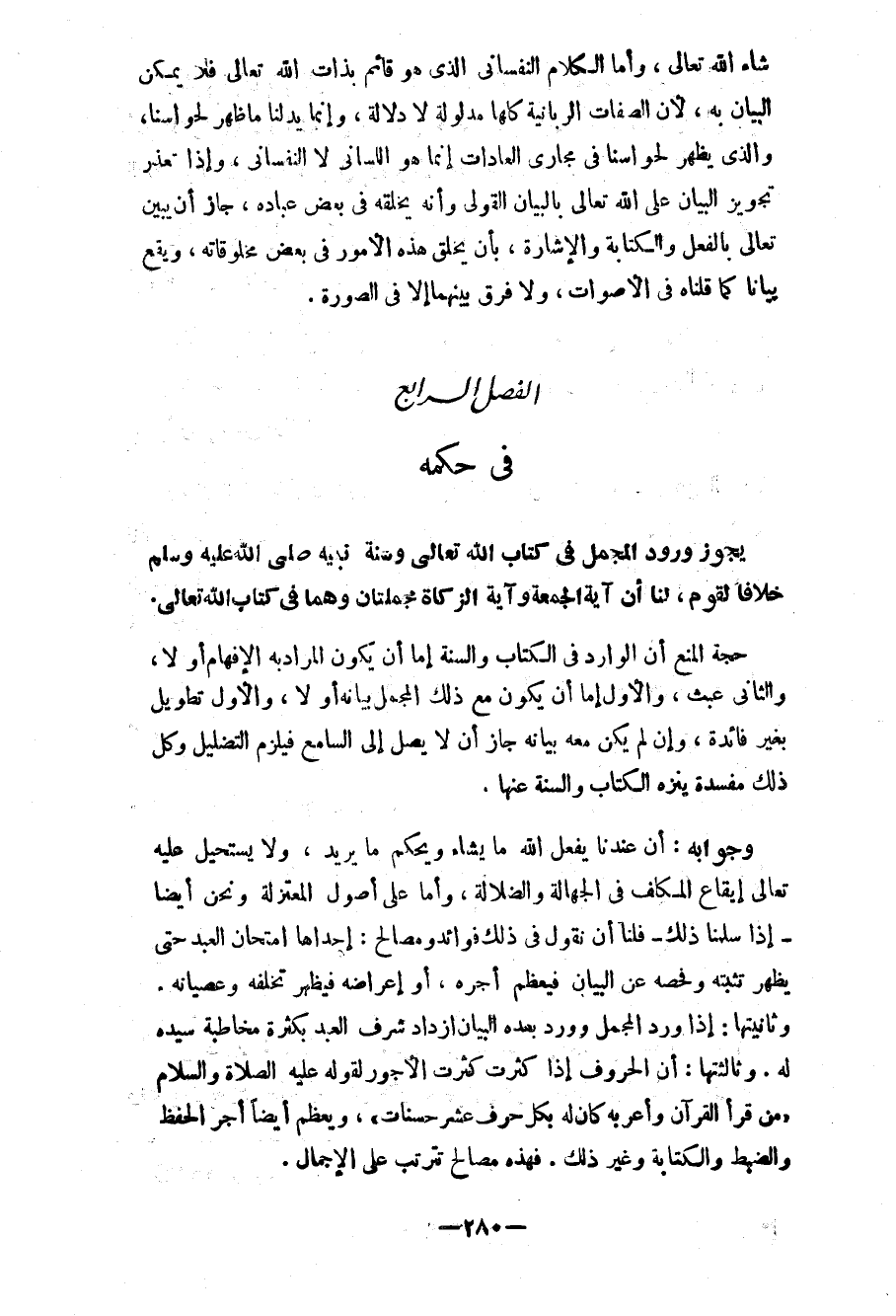 شاء الله تعالى، وأما الكلام النفساني الذي هو قائم بذات الله تعالى فلا يمكن البيان به، لأن الصفات الربانية كلها مدلولة دلالة، وإنما يدلنا ما ظهر لحواسنا، والذي يظهر لحواسنا في مجاري العادات إنّما هو اللساني لا النفساني، وإذا تعذر تجويز البيان على الله تعالى بالبيان القولي وأنه يخلقه في بعض عباده، جاز أن يبين تعالى بالفعل والكتابة والإشارة، بأن يخلق هذه الأمور في بعض مخلوقاته، ويقع بياناً كما قلناه في الأصوات، ولا فرق بينهما إلاّ في الصورة.