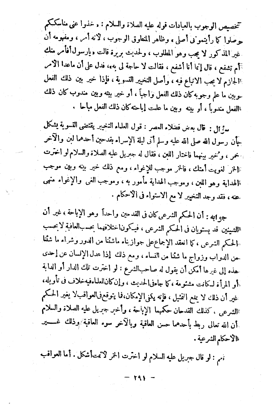 سؤال: قال بعض فضلاء العصر: قول العلماء التخيير يقتضي التسوية يشكل بأن رسول الله - صلى الله عليه وسلم - أتى ليلة الإسراء بقدحين أحدهما لبن والآخر خمر، وخُير بينهما فاختار اللبن، فقال له جبريل عليه الصلاة والسلام لو اخترت الخمر لغويت أمتك، فالخمر موجب للإغواء، ومع ذلك خير بينة وبين موجب الهداية وهو اللبن، وموجب الهداية مأمور به، وموجب الغي والإغواء منهي عنه، فقد وجد التخيير لا مع الاستواء في الأحكام.