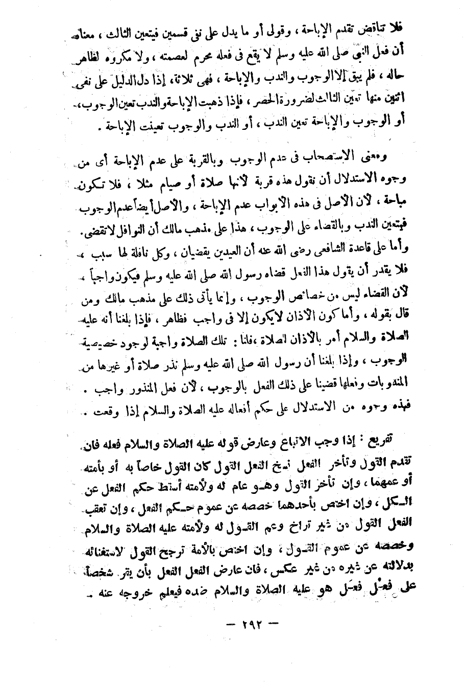 ومعنى الاستصحاب في عدم الوجوب وبالقربة على عدم الإباحة أي من وجوه الاستدلال أن نقول هذه قربة لأنها صلاة أو صيام مثلاً، فلا تكون مباحة، لأن الصلاة في هذه الأبواب عدم الإباحة، والأصل أيضاً عدم الوجوب فيتعين الندب وبالقضاء على الوجوب، هذا على مذهب مالك أن النوافل لا تقضى. وأما على قاعدة الشافعي رضي الله عنه أن العيدين يقضيان، وكل نافلة لها سبب، فلا يقدر أن يقول هذا الفعل قضاه رسول الله - صلى الله عليه وسلم - فيكون واجباً، لأن القضاء ليس من خصائص الوجوب، وإنما يأتي ذلك على مذهب مالك ومن قال بقوله، وأما كون الأذان لا يكون غلا في واجب فظاهر، فإذا بلغنا أنه عليه الصلاة والسلام أمر بالأذان للصلاة، قلنا: تلك الصلاة واجبة لوجود خصيصية الوجوب، وإذا بلغنا أن رسول الله - صلى الله عليه وسلم - نذر صلاة أو غيرها من المندوبات وفعلها قضينا على ذلك الفعل بالوجوب، لأن فعل المنذور واجب، فهذه وجوه من الاستدلال على حكم أفعاله عليه الصلاة والسلام إذا وقعت.