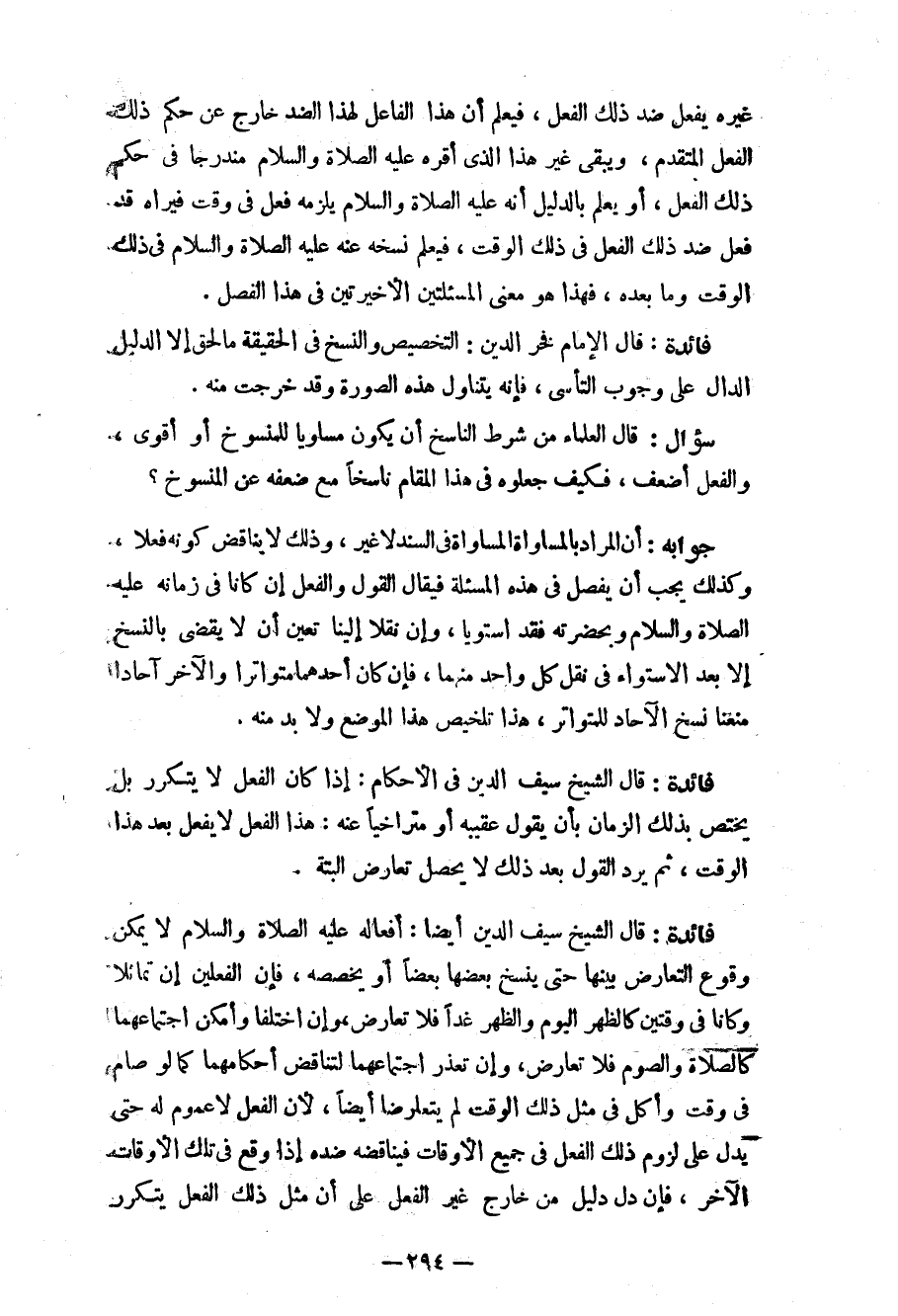 غيره يفعل ضد ذلك الفعل، فيعلم أن هذا الفاعل لهذا الضد خارج عن حكم ذلك الفعل المتقدم، ويبقى غير هذا الذي أقره عليه الصلاة والسلام يلزمه فعل في وقت فيراه قد فعل ضد ذلك الفعل في ذلك الوقت، فيعلم نسخه عنه عليه الصلاة والسلام في ذلك الوقت وما بعده، فهذا هو معنى المسالتين الأخيرتين في هذا الفصل.