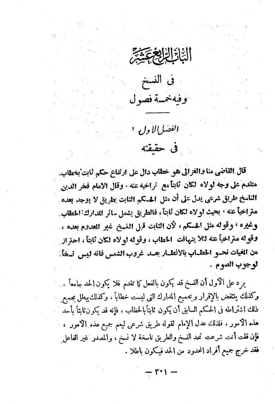 يرد على الأوّل أن النسخ قد يكون بالفعل كما تقدم فلا يكون الحد جامعاً وكذلك ينتقض بالإقرار أو بجميع المدارك التي ليست خطاباً، وكذلك يبطل بجميع ذلك اشتراطه في الحكم السابق أن يكون ثابتاً بالخطاب، فإنه قد يكون ثابتاً بأحد هذه الأمور، فلذلك عدل الإمام لقوله طريق شرعي ليعم جميع هذه الأمور، فإن قلت أنت شرعت نحد النسخ والطريق ناسخة لا نسخ، والمصدر غير الفاعل فقد خرج جميع أفراد المحدود من الحد فيكون باطلاً.