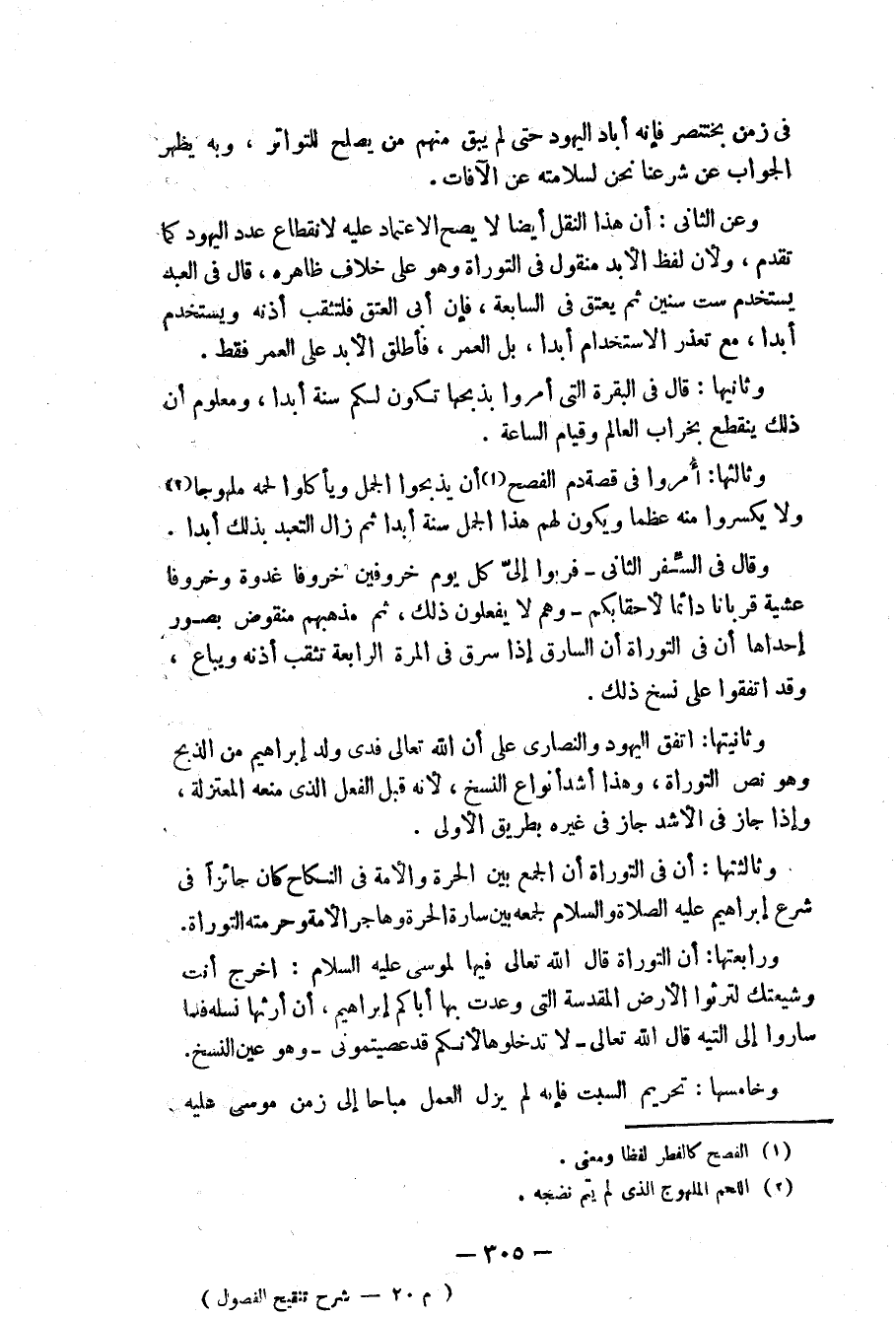 وعن الثاني: أن هذا النقل أيضاً لا يصح الاعتماد عليه لانقطاع عدد اليهود كما تقدم، ولأن لفظ الأبد منقول في التوراة وهو على خلاف ظاهره، قال في العبد يستخدم ست سنين ثم يعتق في السابعة، فإن أبى العتق فلتثقب أذنه ويستخدم أبداً، مع تعذر الاستخدام أبداً، بل العمر، فأطلق الأبد على العمر فقط.
