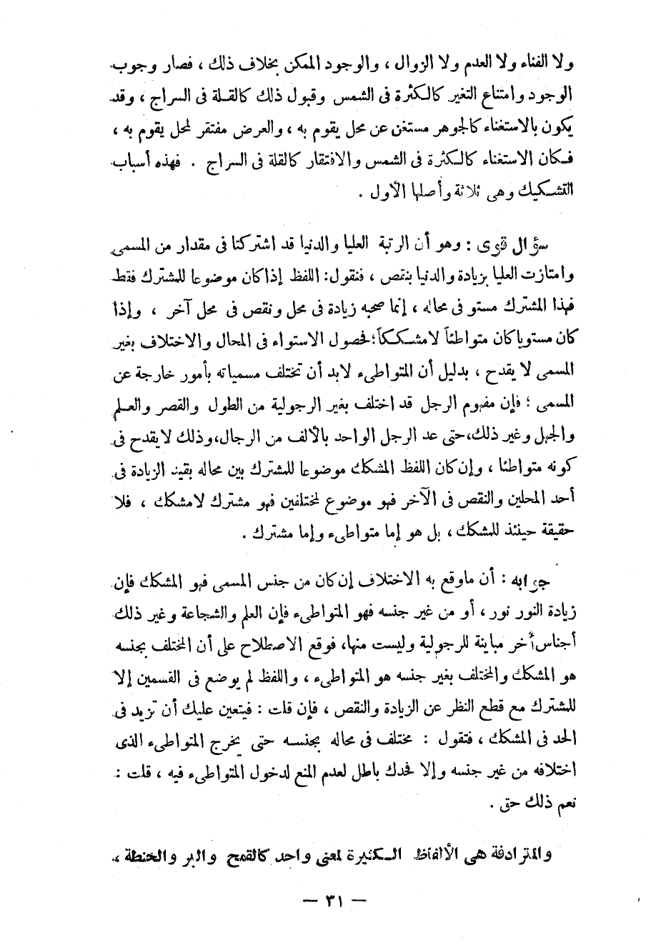 ولا الفناء ولا العدم ولا الزوال، والوجود الممكن يخلاف ذلك، فصار وجوب الوجود وامتناع التغير كالكثرة في الشمس وقبول ذلك كالقلة في السراج، وقد يكون بالاستغناء كالجوهر مستغن عن محل يقوم به، والعرض مفتقر لمحل يقوم به، فكان الاستغناء كالكثرة في الشمس والافتقار كالقلة في السراج. فهذه أسباب التشكيك وهي ثلاثة وأصلها الأول.
