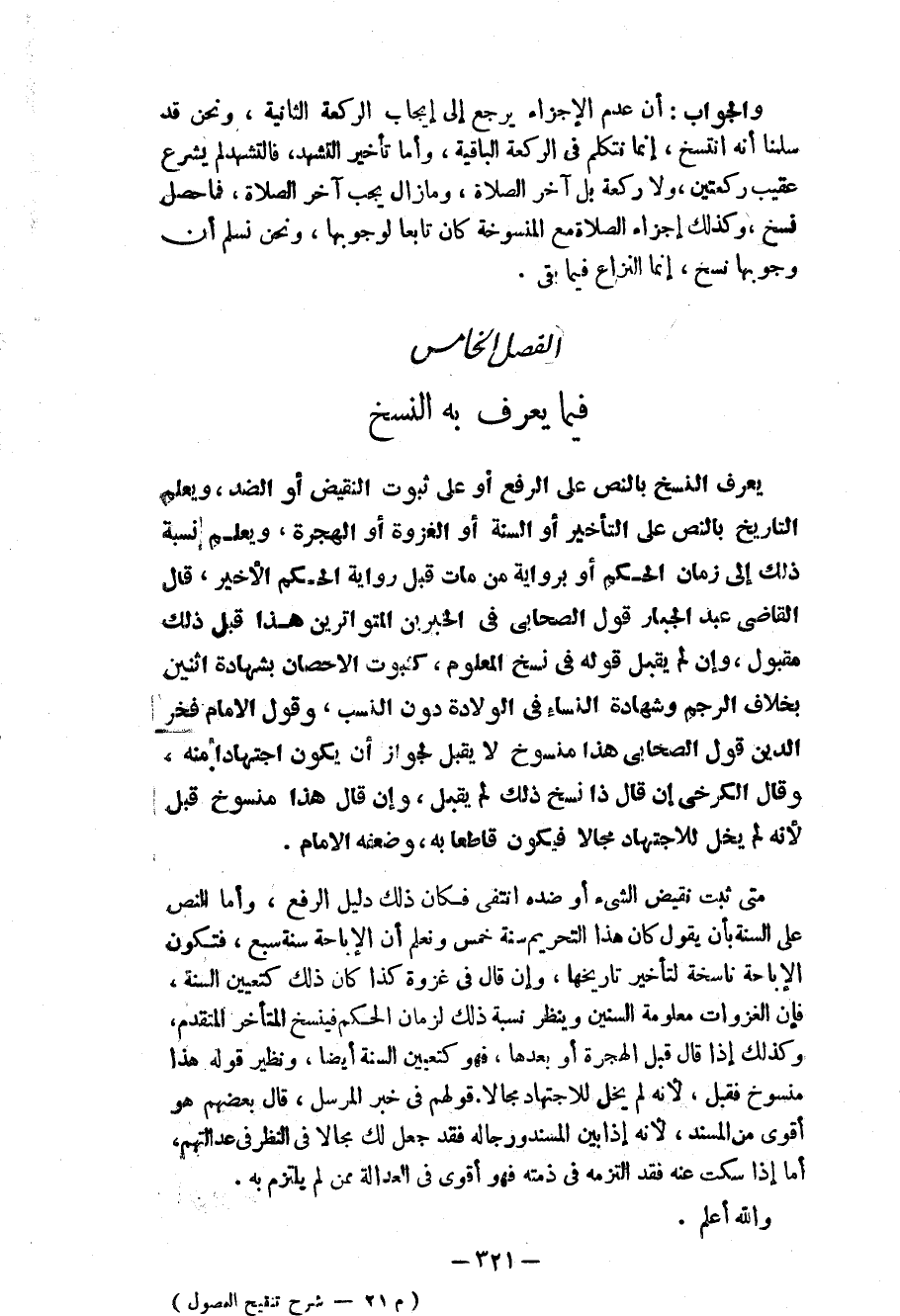 متى ثبت نقيض الشيء أو ضده انتفى فكان ذلك دليل الرفع، وأما النص على السنة بأن يقول كان هذا التحريم سنة خمس ونعلم أن الإباحة سنة سبع، فتكون الإباحة ناسخة لتأخير تاريخها، وإن قال في غزوة كذا كان ذلك كتعيين السنة، فإن الغزوات معلومة السنين وينظر نسبة ذلك لزمان الحكم فينسخ المتأخر المتقدم وكذلك إذا قال قيل الهجرة أو بعدها، فهو كتعيين السنة أيضاً، ونظير قوله هذا منسوخ فقبل، لأنه لم يخل للاجتهاد مجالاً. قولهم في خبر المرسل، قال بعضهم هو أقوى من المسند، لأنه إذا بين المسند ورجاله فقد جعل لك مجالاً في النظر في عدالتهم، أما إذا سكت عنه فقد التزمه في ذمته فهو أقوى في العدالة ممن لم يلتزم به.