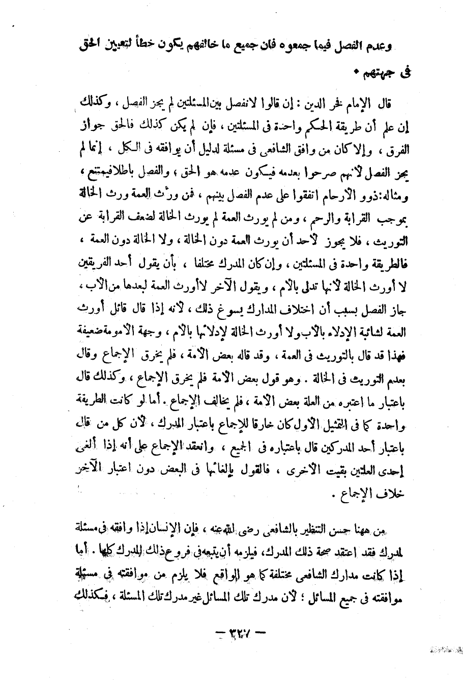 قال الإمام فخر الدين: إن قالوا لا نفصل بين المسألتين لم يجز الفصل، وكذلك إن علم أن طريقة الحكم واحدة في المسألتين، فإن لم يكن كذلك فالحق جواز الفرق، وإلا كان من وافق الشافعي في مسألة لدليل أن يوافقه في الكل، إنّما لم يجز الفصل لأنهم صرحوا بعدمه فيكون عدمه هو الحق، والفصل باطلاً فيمتنع، ومثاله: ذوو الأرحام اتفقوا على عدم الفصل بينهم، فمن ورث العمة ورث الخالة بموجب القرابة ولارحم، ومن لم يورث العمة لم يورث الخالة لضعف القرابة عن التوريث، فلا يجوز لأحد أن يورث العامة دون الخالة، ولا الخالة دون العمة، فالطريقة واحدة في المسألتين، وإن كان المدرك مختلفاً، بأن يقول أحد الفريقين لا أورث الخالة لأنها تدلي بالأم، ويقول الآخر لا أورث