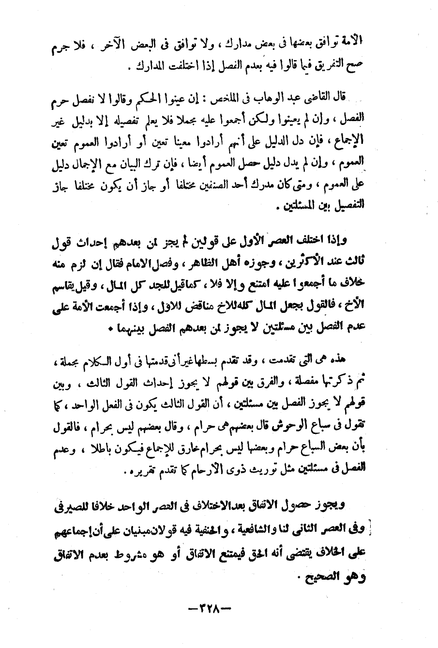 وإذا اختلف العصر الأوّل على قولين لم يجز لمن بعدهم إحداث قول ثالث عند الأكثرين، وجوزه أهل الظاهر، وفصل الإمام فقال إن لزم منه خلاف ما أجمعوا عليه امتنع وإلا فلا، كما قيل للجد كلّ المال، وقيل يقاسم الأخ، فالقول يجعل المال كله للأخ مناقض للأول، وإذا أجمعت الأمة على عدم الفصل بين مسألتين لا يجوز لمن بعدهم الفصل بينهما.