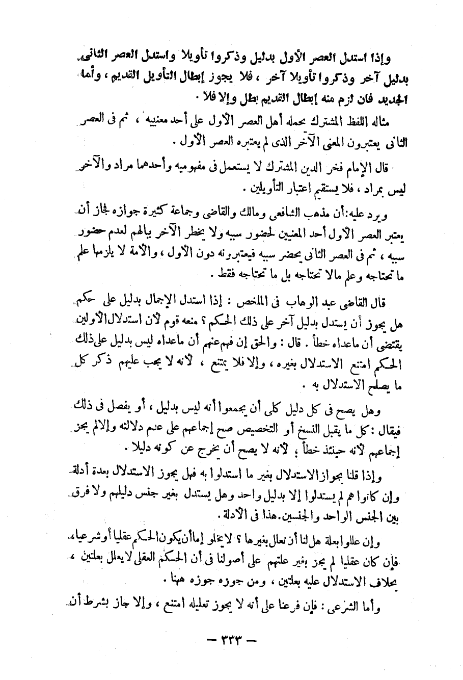ويرد عليه: أن مذهب الشافعي ومالك والقاضي وجماعة كثيرة جوازه فجاز أن يعتبر العصر الأوّل أحد المعنيين لحضور سببه ولا يخطر الآخر ببالهم لعدم حضور سببه، ثم في العصر الثاني يحضر سببه فيعتبرونه دون الأوّل، والأمة لا يلزمها علم ما تحتاجه وعلم ما لا تحتاجه بل ما تحتاجه فقط.