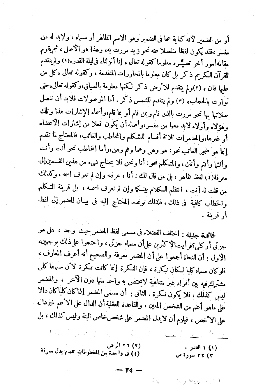 أو من الضمير لأنه كناية عما في الضمير وهو الاسم الظاهر أو مسماه، ولا بد له من مفسر، فقد يكون لفظاً منفصلاً عنه نحو زيد مررت به، وهذا هو الأصل، ثم يقوم مقامه أمور أخر تصيِّره معلوماً كقوله تعالى «إنا أنزلناه في ليلة القدر» (¬1) ولم يتقدم للقرآن الكريم ذكر بل كان معلوماً بالمحاورات المتقدمة، وكقوله تعالى «كل من عليها فان» (¬2) ولم يتقدم الأرض ذكر لكنها معلومة بالسياق، وكقوله تعالى «حتى توارت بالحجاب» (¬3) ولم يتقدم للشمس ذكر. أما الموصلات فلا بد أن تتصل صلاتها بها نحو مررت بالذي قام وبمن قام أو بما قام، وأسماء الإشارة هذا وتلك وهؤلاء وأولاء لا بد معها من مفسر، وأصله أن يكون فعلاً من إشارات الأعضاء أو غيرها، والمضمرات ثلاثة أقسام للمتكلم والمخاطب والغائب، فالمحتاج لما تقدم إنما هو ضمير الغائب نحو: هو وهي ونما وهم وهن، وأما المخاطب نحو أنت وأنت وأنتما وأنتم وأنتن، والمتكلم نحو: أنا ونحن فلا يحتاج شيء من هذين القسمين إلى معرفة (¬4) لفظ ظاهر، بل من قال لك: أنا، عرفته وإن لم تعرف اسمه، وكذلك من قلت له أنت، انتظم الكلام بينكما وإن لم تعرف اسمه، بل قرينة التكلم والخطاب كافية في ذلك، فلذلك نوعت المحتاج إليه في بيان المضمر إلى لفظ أو قرينة.
