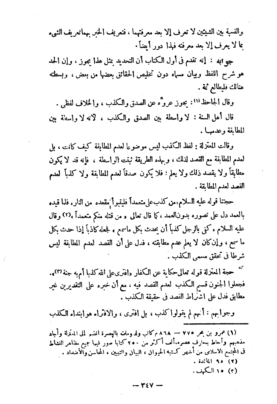 (¬1) عمرو بن بحر 775-868م كاتب ولد ومات بالبصرة، انضم إلى المعتزلة وأجاد مذهبهم وأحاط بمعارف عصره. ألف أكثر من 250 كتاباً صور فيها جميع مظاهر النشاط في المجتمع الإسلامي من أشهر كتبه الحيوان، البيان والتبيين، المحاسن والأضداد.