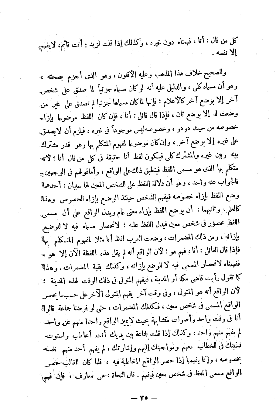 والصحيح خلاف هذا المذهب وعليه الأقلون، وهو الذي أجزم بصحته وهو أن مسماه كلي، والدليل عليه أنه لو كان مسماه جزئياً لما صدق على شخص آخر غلا بوضع آخر كالأعلام؛ فإنها لما كان مسماها جزئياً لم تصدق على غير من وضعت له إلا بوضع ثان، فإذا قال قائل: أنا، فإن كان اللفظ موضوعاً بإزاء خصوصه من حيث هو هو، وخصوصه ليس موجوداً في غيره، فيلزم أن لا يصدق على غيره إلا بوضع آخر، وإن كان موضوعاً لمفهوم المتكلم بها وهو قدر مشترك بينه وبين غيره والمشترك كلي فيكون لفظ أنا حقيقة في كل ممن قال أنا؛ لأنه متكلم بها الذي هو مسمى اللفظ فينطبق ذلك على الواقع، وأما قولهم في الوجهين: فالجواب عنه واحد، وهو أن دلالة اللفظ على الشخص المعين لها سببان: أحدهما وضع اللفظ بإزاء خصوصه فيفهم الشخص حينئذ الوضع بإزاء الخصوص وهذا كالعلم. وثانيهما: أن يوضع اللفظ بإزاء معنى عام ويدل الواقع على أن مسمى اللفظ محصور في شخص معين فيدل اللفظ عليه؛ لانحصار مسماه فيه لا للوضع بإزائه، ومن ذلك المضمرات، وضعت العرب لفظ أنا مثلاً لمفهوم المتكلم بها فإذا قال القائل: أنا، فهم هو؛ لأن الواقع أنه لم يقل هذه اللفظة الآن إلا هو، ففهمناه لانحصار المسمى فيه لا للوضع بإزائه، وكذلك بقية المضمرات. وهذا كما تقول رأيت قاضي مكة أو المدينة، فيفهم المتولي في ذلك الوقت لهذه المدينة لن الواقع أنه هو المتولي، وفي وقت آخر يفهم المتولي الآخر على حسب ما يحصر الواقع المسمى في شخص معين، فكذلك المضمرات، حتى لو فرضنا جماعة قالوا أنا في وقت واحد وأصوات متشابهة بحيث لا يميز الواقع واحداً منهم عن واحد لم يفهم منهم واحد، وكذلك إذا قلت الجماعة بين يديك أنت أخاطب واستوت نسبتك في الخطاب معهم ومواجهتك إليهم وإشارتك، لم يفهم أحد منهم نفسه بخصوصه، وإنما يفهمها إذا حصر الواقع المخاطبة فيه، فلما كان الغالب حصر الواقع مسمى اللفظ في شخص معين فيفهم.
