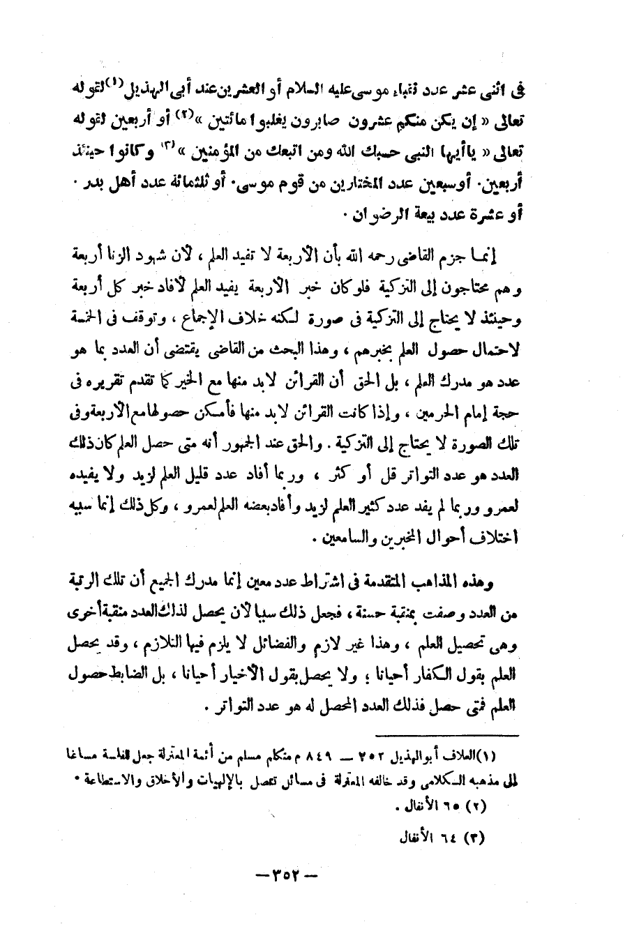 وهذه المذاهب المتقدمة في اشتراط عدد معين إنّما مدرك الجميع أن تلك الرتبة من العدد وصفت بمنقبة حسنة، فجعل ذلك سبباً لأن يحصل لذلك العدد منقبة أخرى وهي تحصيل العلم، وهذا غير لازم والفضائل لا يلزم فيها التلازم، وقد يحصل العلم بقول الكفار أحياناً؛ ولا يحصل بقول الأخيار أحياناً، بل الضابط حصول العلم فمتى حصل فذلك العدد المحصل له هو عدد التواتر.