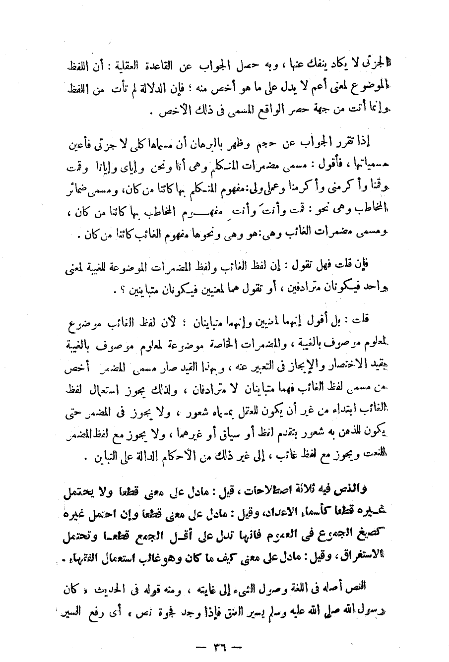 قلت: بل أقول إنهما لمعنيين وإنهما متباينان؛ لأن لفظ الغائب موضوع لمعلوم موصوف بالغيبة، والمضمرات الخاصة موضوعة لمعلوم موصوف بالغيبة يقيد الاختصار والإيجاز في التعبير عنه، وبهذا القيد صار مسمى المضمر أخص من مسمى لفظ الغائب فهما متباينان لا مترادفان، ولذلك يجوز استعمال لفظ الغائب ابتداءً من غير أن يكون للعقل بمسماه شعور، ولا يجوز في المضمر حتى يكون للذهن به شعور بتقدم لفظ أو سياق أو غيرهما، ولا يجوز مع لفظ المضمر النعت ويجوز مع لفظ غائب، إلى غير ذلك من الأحكام الدالة على التباين.